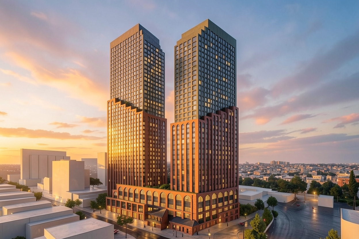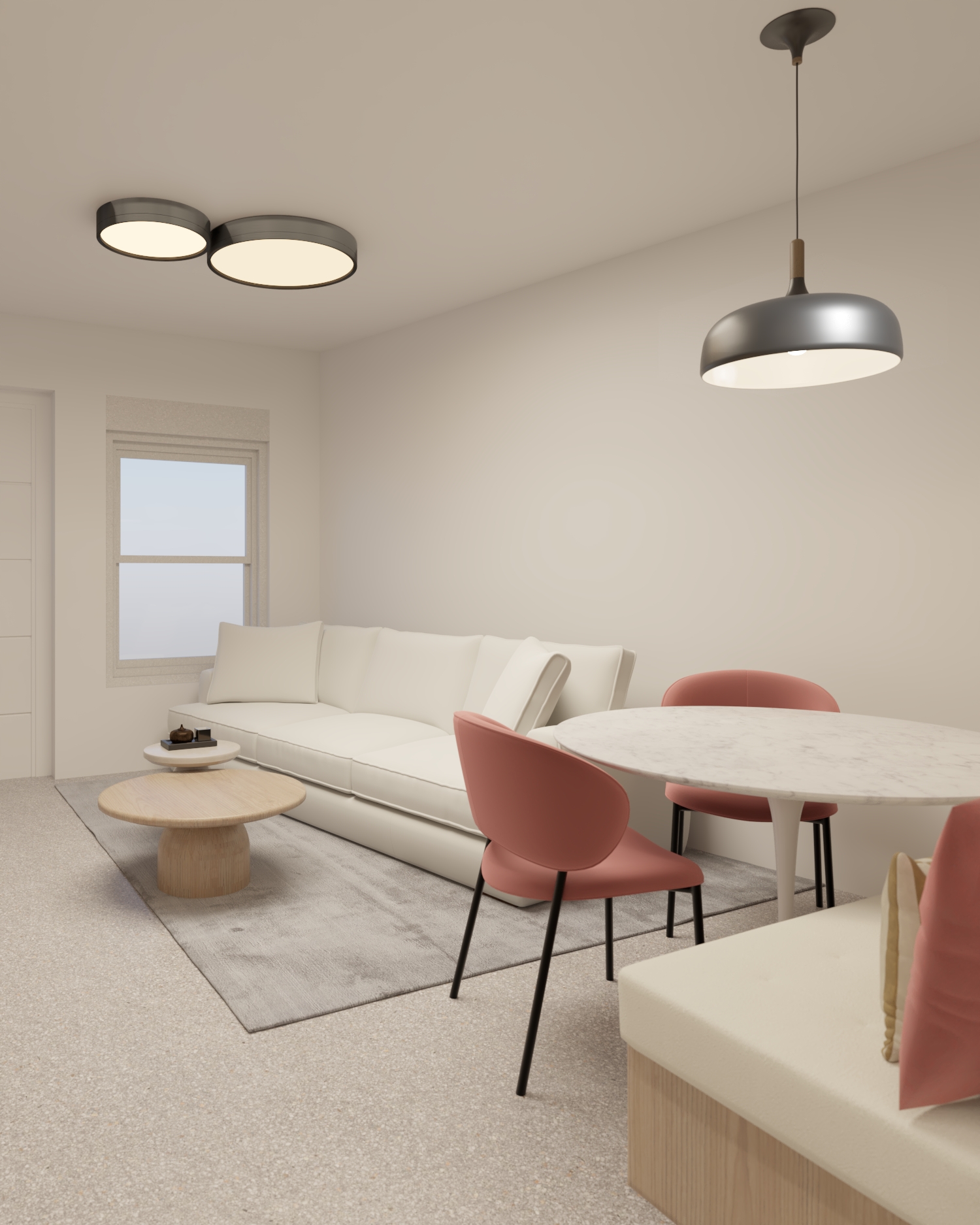 photorealistic interior of a modern residence warm and elegant atmosphere modern design white marble countertop brass metal details and hanging brass pendant lights coral red upholstered chairs and small white marble tables light moca textured walls with arches soft indirect lighting cinematic interior lighting warm ambient light 3000k realistic global illumination soft shadows volumetric light entering from windows subtle reflections on marble and brass highly detailed materials ultra realistic wood grain premium fabric textures architectural photography depth of field shot with 35mm lens high dynamic range natural light mixed with warm interior lighting atmosphere ultra photorealistic archviz render 8k corona renderer style vray lighting dramatic but soft lighting light grey floor tiles with a smooth refelction put smooth white velour fabrick at the bench that exist on the wall at the dinning area
