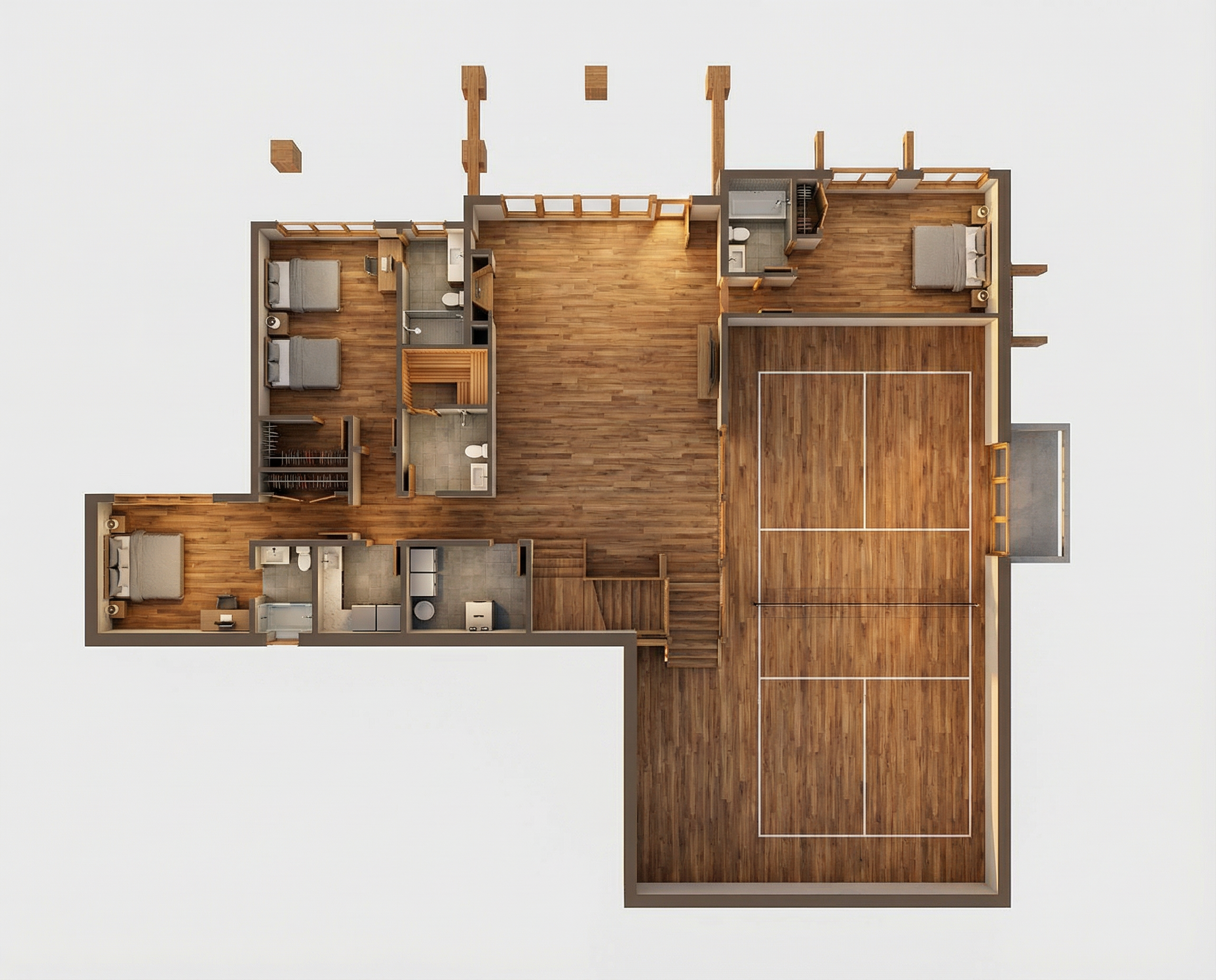 convert this floor plan into a realistic isometric 3d view of a full house show the space from an elevated angle with furniture walls and details visible wood floors modern furniture sport court concrete floor use the same furniture as shows on the plan do not change the orientation of the floorplan
