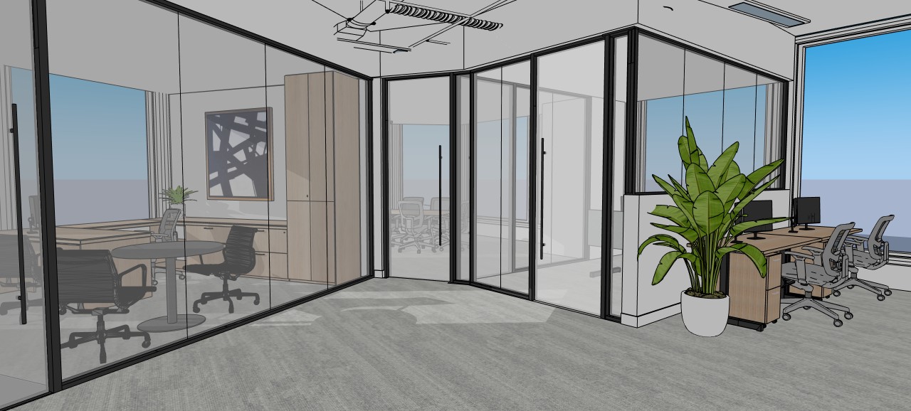 vancouver coal harbour background keep same as original image grey carpet floor make ceilings inside offices flat drywall white add in lighting 2700k