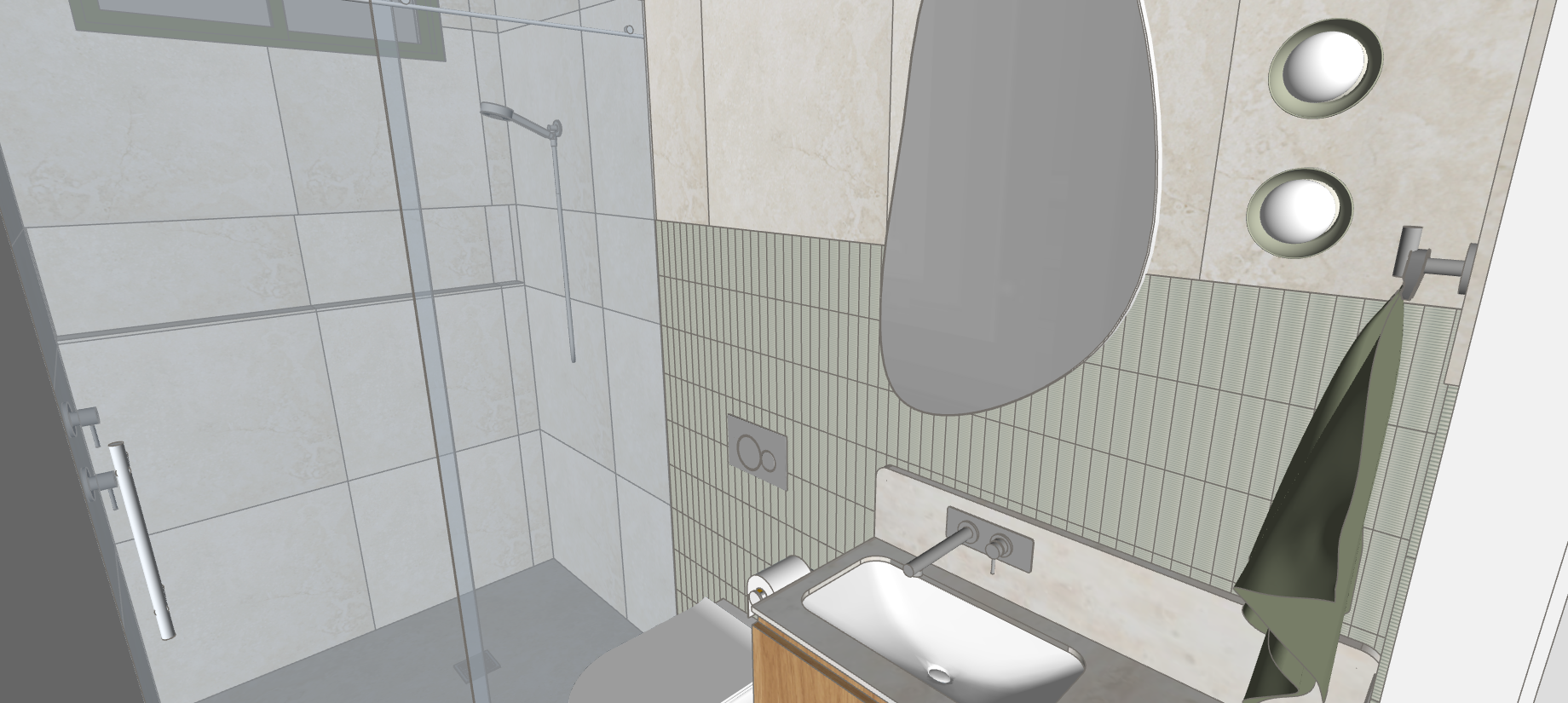 render this bathroom exactly like the image on the floor and walls is a 600x1200mm creamy beige tile with subtle veining behind the vanity is a mosaic finger tile with greens and whites veining through it run this tile from the floor to half way up the wall with the wall mounted tapware poking through make it one row less of the mosaic tile than the image for the height the section of wall with the mosaic tile goes from the right side of the vanity to the left of the toilet and stops at the shower screen it is at the same height there is a splashback above the vanity the same stone as the benchtop with rounded ends the tapware is sitting just above the vanity splashback add warm light from the sconces green towels are hanging on the towel rails and the towel hook