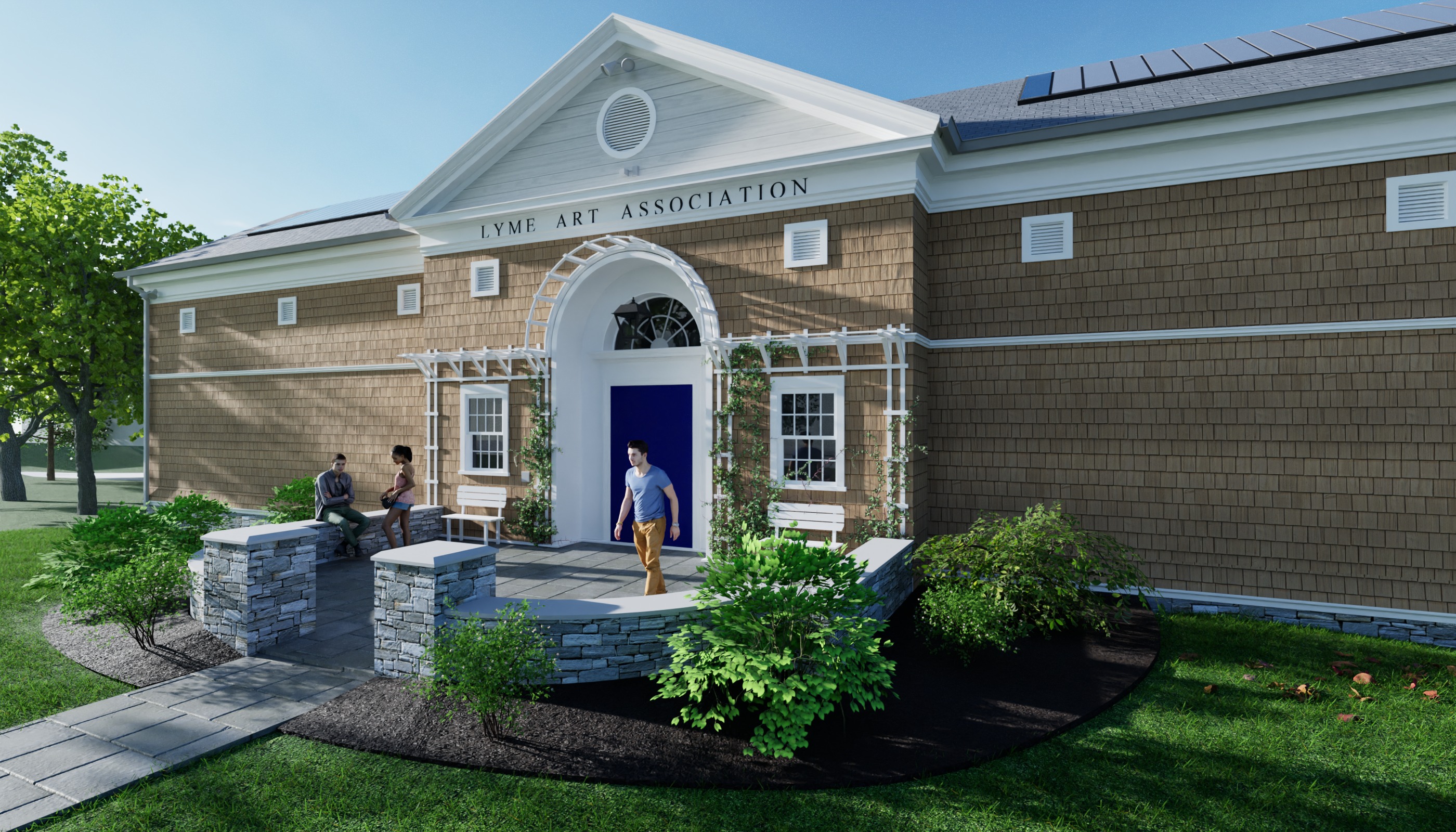 increase the realism of this render this is the front entrance for a local art gallery the siding is a light natural wood shingle and the roof is a dark slate shingle there is a low stone wall surrounding the entrance making a patio this patio is surrounded by manicured plantings at the entrance rose bushes are climbing a white trellis the door is painted blue the sky is sunny with puffy white clouds the end gable is white
