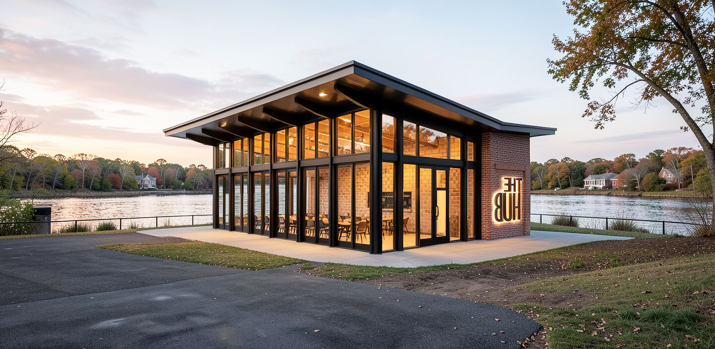 building on a concrete pad surrounded by a manicured lawn with historic brick buildings in the background