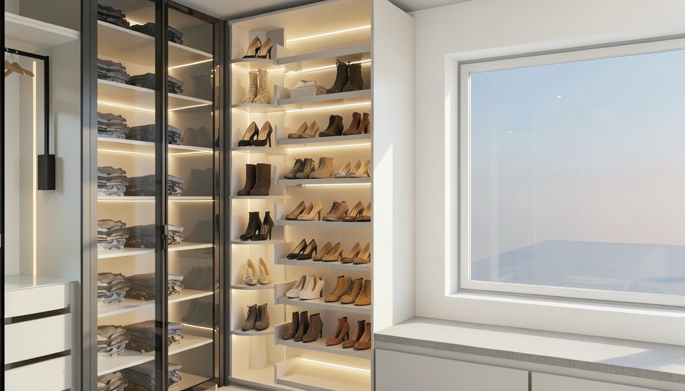 accesories on the left side and shoes on the right side add led lights keep clean the window and the stool