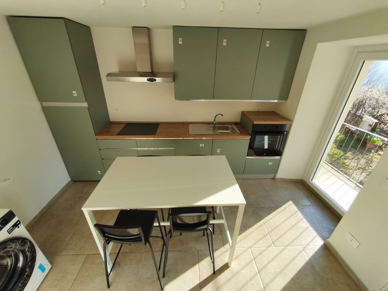 this is a real photo of a small modern kitchen with green cabinets a dining table and a washing machine on the left preserve the exact layout camera angle and architecture clean and declutter the scene remove any objects from the kitchen countertop bottles items clutter keep the countertop clean and minimal improve styling in a subtle realistic way keep the green kitchen cabinets exactly as they are maintain natural daylight from the window hide only the washing machine in a realistic way cover it with a simple minimal cabinet panel or light wood cover consistent with the kitchen style keep the dining table and chairs unchanged just aligned them to be straight integrate it visually so it blends naturally with the surrounding furnitureenhance lighting to be soft warm and natural with gentle sunlight coming from the window slightly improve textures and colors while keeping everything realistic do not change layout or structure add new furniture redesign the kitchen alter cabinet colors or positions the final image should look like a clean professionally photographed airbnb kitchen natural and realistic