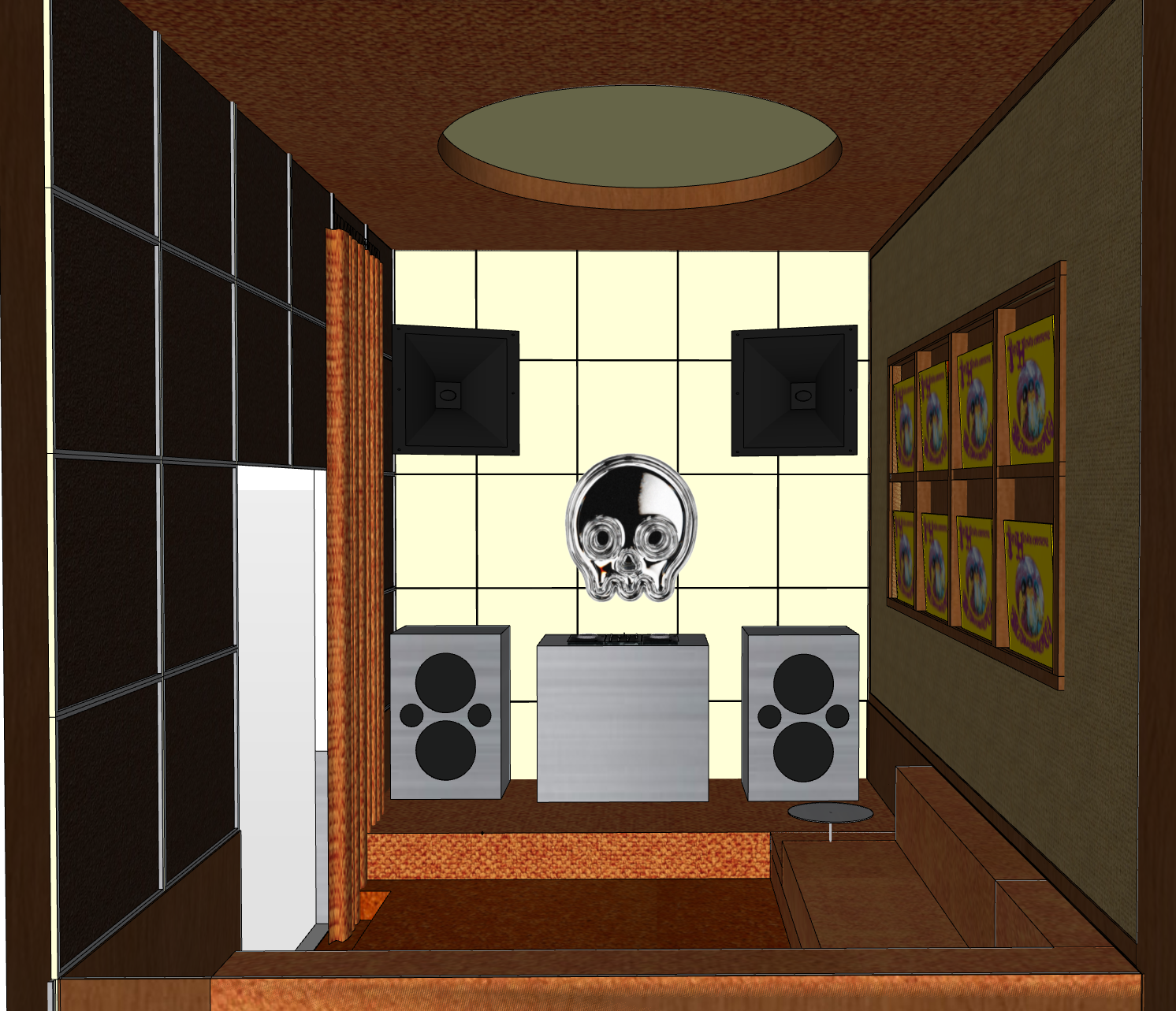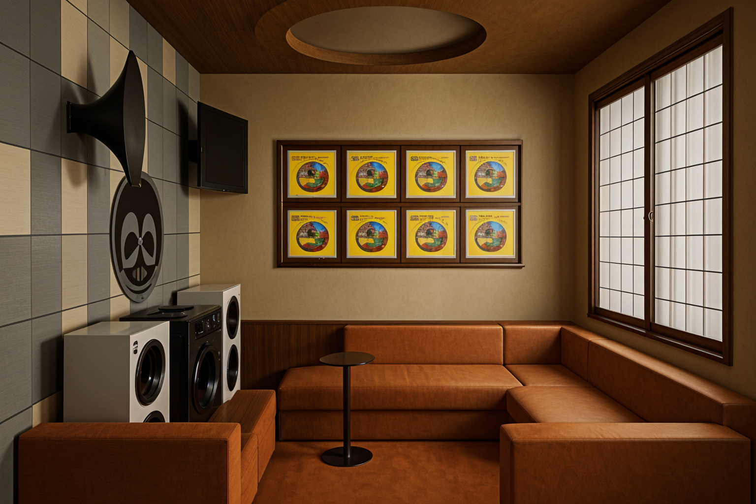 the aesthetic blends hi fi culture japanese restraint and retro futurist warmth resulting in interiors that feel at once timeless and forward thinking these are not just rooms but environments designed for mood sound and social connection living lounge mid century sensibility with clean lined built ins low seating and muted tones the mirrored backdrop doubles the depth while contemporary art objects and greenery soften the geometry conversation pit immersive room a sculptural circular environment bathed in amber light the stepped seating and glowing central element create a sense of gathering ritual and performance a futuristic nod to 1970s social architecture listening lounge dramatic oversized suspended speakers become sculptural focal points against a backlit vinyl wall the custom shelving and curved banquettes encourage slow listening and conversation evoking a high fidelity temple for music