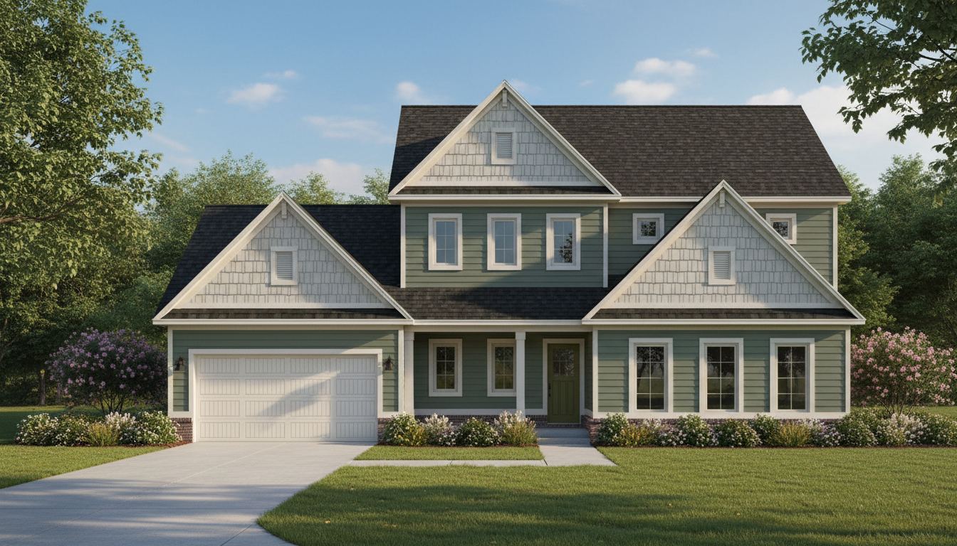 do not change and structure of the architecture i want to see a realistic photo using the architectural blueprint provided make the siding espresso brown cedar wrapped porch columns black gutters make the windows white add matching stone to the waterline add gables to the top of the two roof peaks that match the proch columns add landscaping green grass and trees