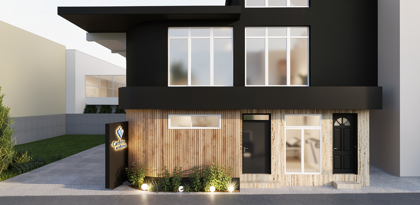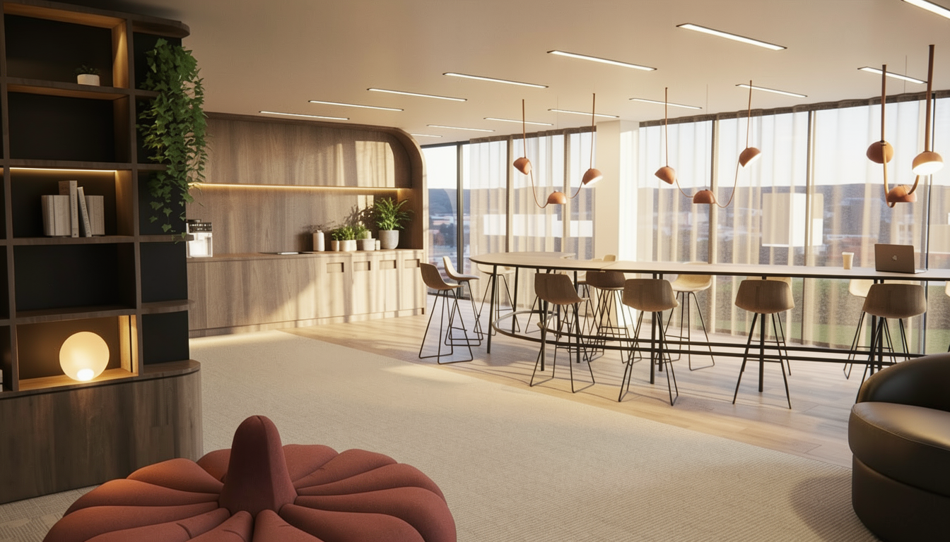 photorealistic industrial loft interior matching the provided architectural model double height space with mezzanine bridge and upper glass enclosed room dark walnut staircase leading to a narrow landing and elevated walkway long built in counter along the right wall below tall louvered windows exposed structural concrete beams and columns white mineral painted plaster walls with subtle aging polished worn concrete floor minimal contemporary cabinetry under the mezzanine scandinavian industrial aesthetic calm architectural photography mood 35mm lens eye level perspective straight vertical lines slightly rough limewashed white walls with tonal variation and micro cracks weathered concrete columns and beams with pores and patches worn polished concrete floor with soft reflection dark walnut stair matte oiled finish lightly worn edges wood countertop natural oak slightly aged realistic imperfections refined patina not dirty soft diffused daylight entering from tall side windows and upper clerestory windows balanced interior exposure gentle bounce light filling double height space clear air minimal haze windows bright but not blown out calm airy atmosphere concealed warm led uplighting integrated beneath the long wood counter along the right wall continuous strip from first column to last column soft upward wall wash revealing texture of white plaster and concrete columns warm 3000k subtle intensity secondary to daylight architectural magazine photography filmic tone mapping mid contrast preserved highlights lifted shadows natural color grading
