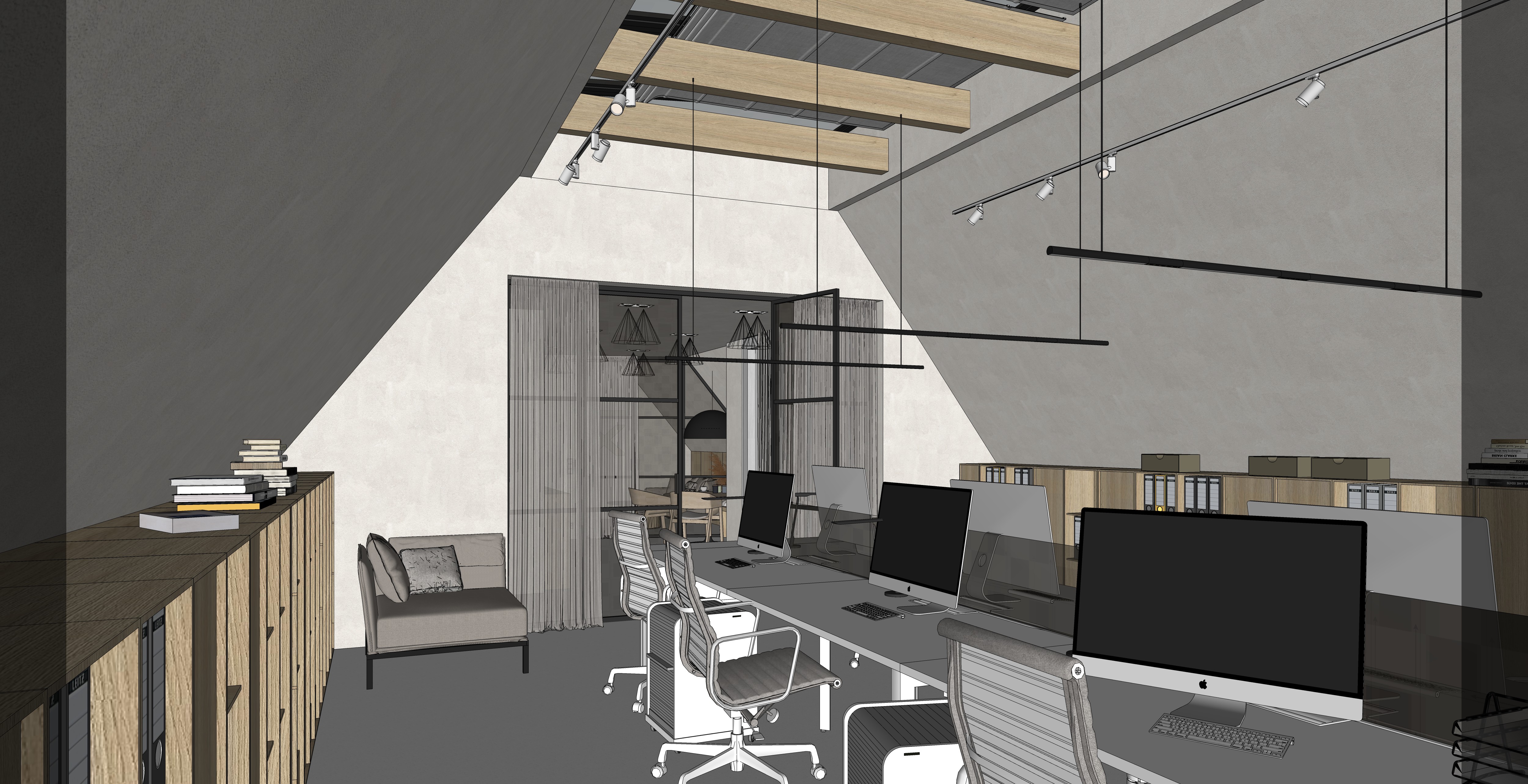 photorealistic interior soft light through the windows white terrazzo floor with small fine stones light oak wood walls and ceiling white natural plaster the desks are white