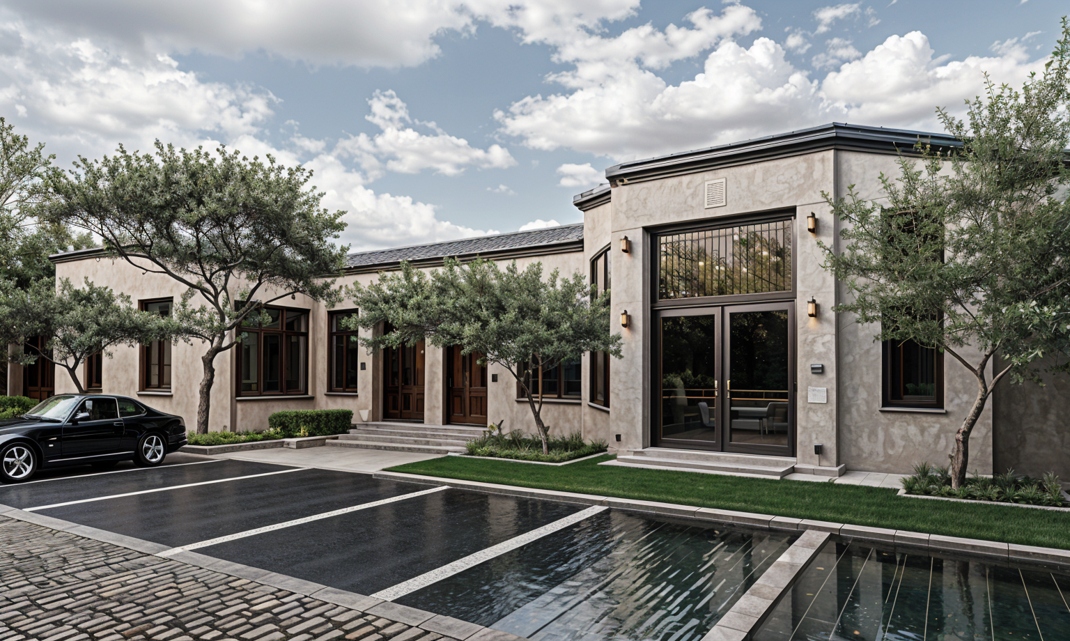 modern style industrial black frame canopy concrete keep the canopy column wall finishing white brick and plywood remove the arch the window is a fixed window frame the front yard has grass and a parking lot tiled roof removed outside finish applies white finish and wood finish only in the middle delete the roof make it modern the exterior of a modern chinese restaurant wood finish is applied to the wall of the middle entrance