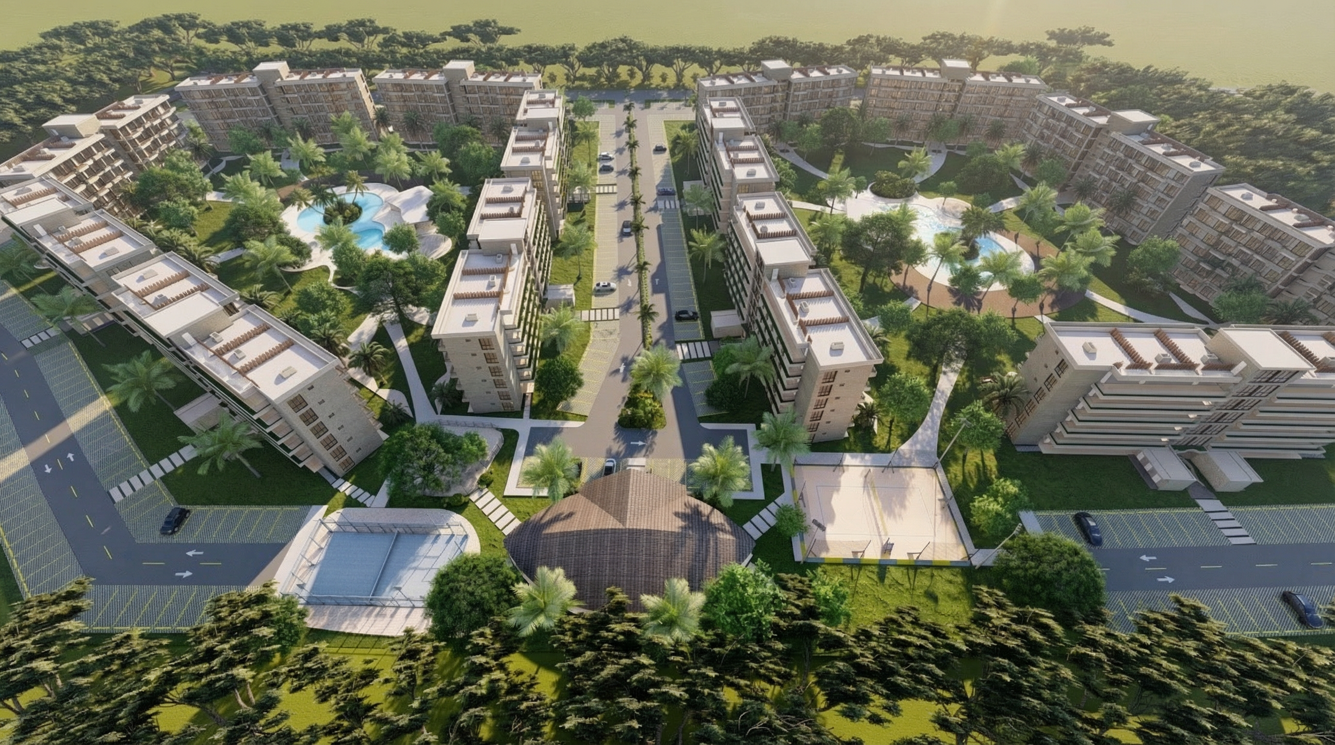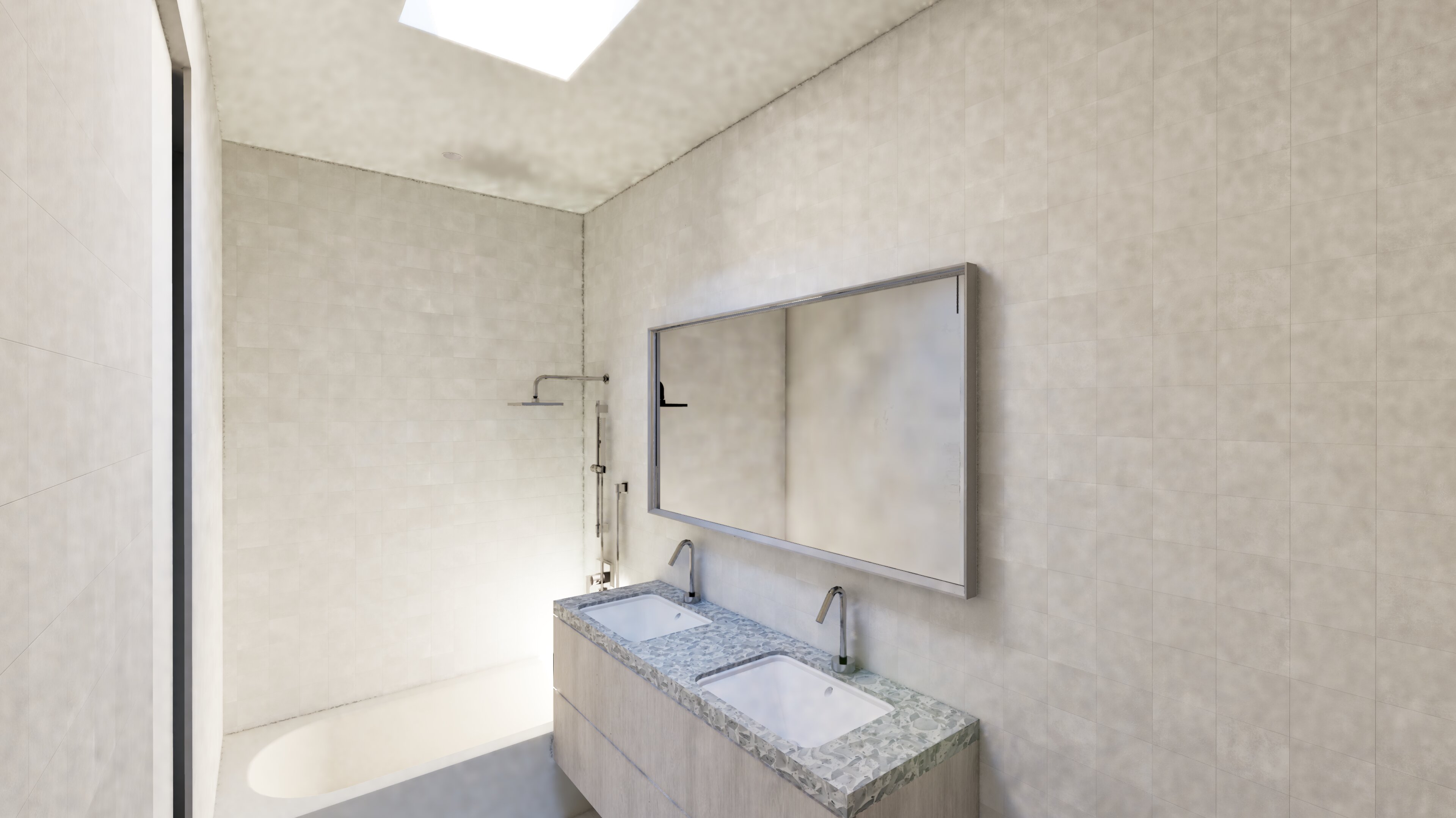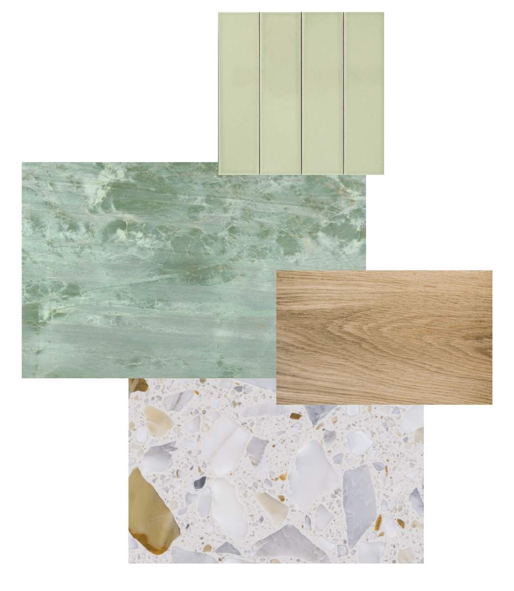 exterior shot ceiling is white gyp walls are ghetty green tiles and countertops are that calm green marble with cabinetry being natural white oak and floor being terrazzo do not change the structure or geometry the ambience is calm with natural coming from the skylight above