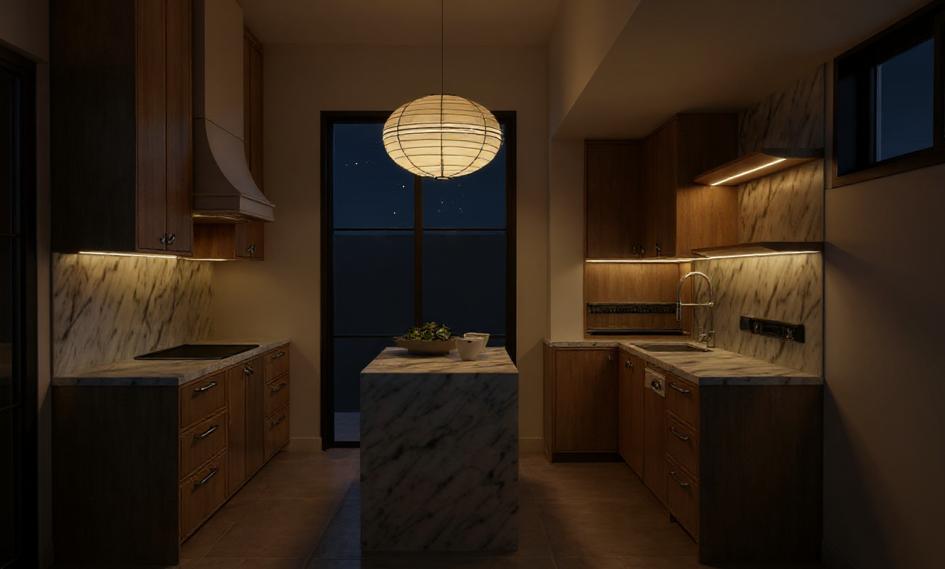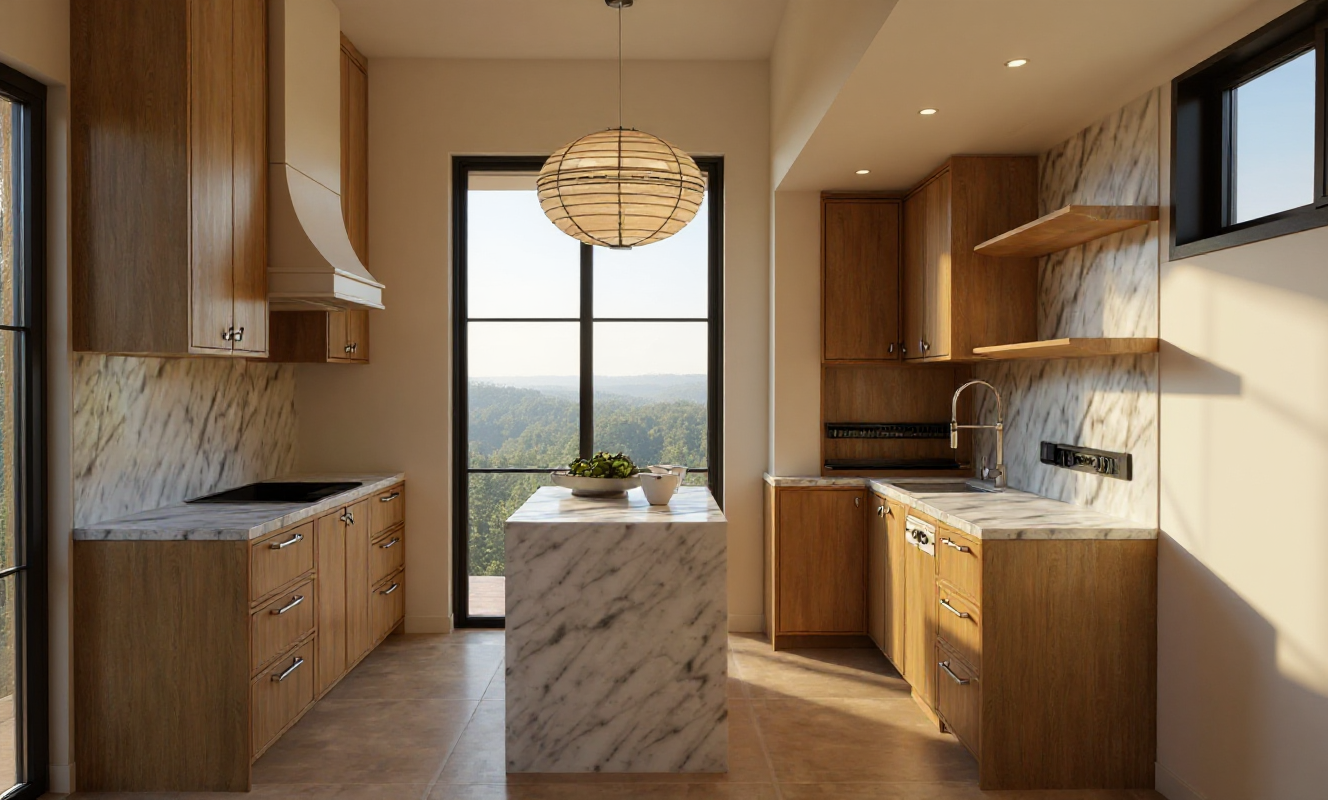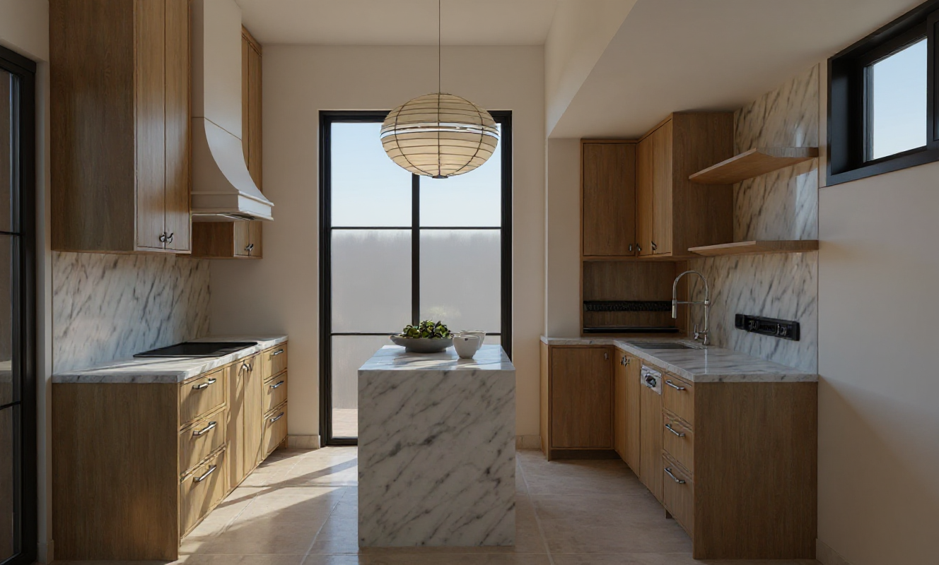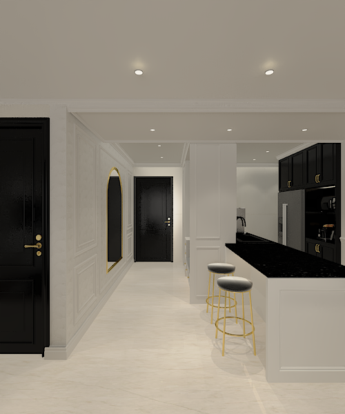 make more realistic do not change any design or layout from the existing image white paint doff wall panels and ceiling with black doors and white kitchen with black gold glossy granite top table flooring using beige glossy marble finish with fine pattern in it create a general modern classic design ambiance