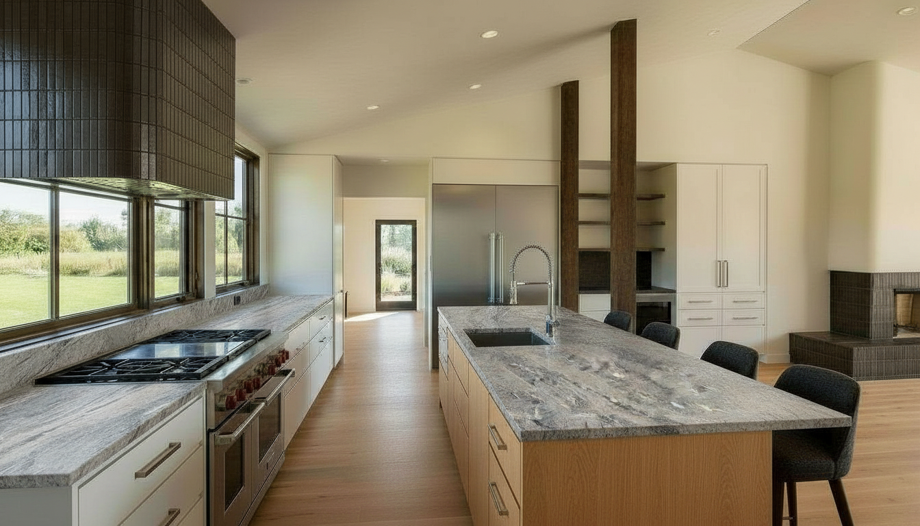 change the white cabinetry to wood to match the island make the columns log