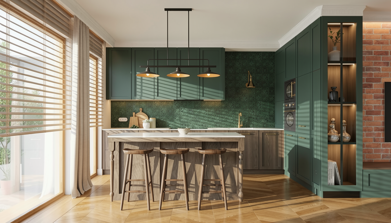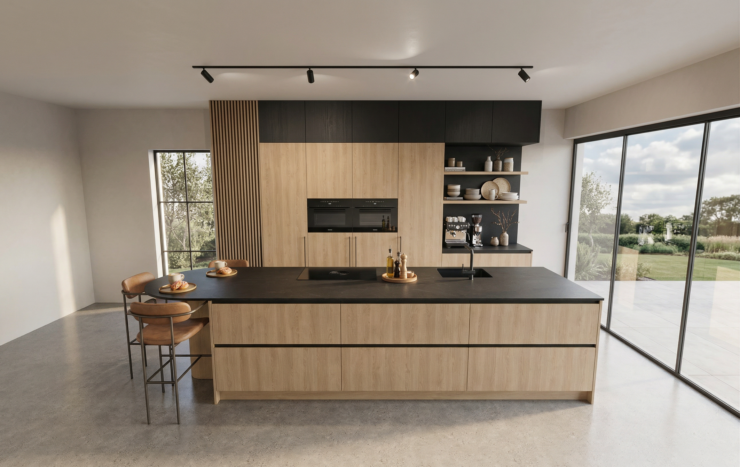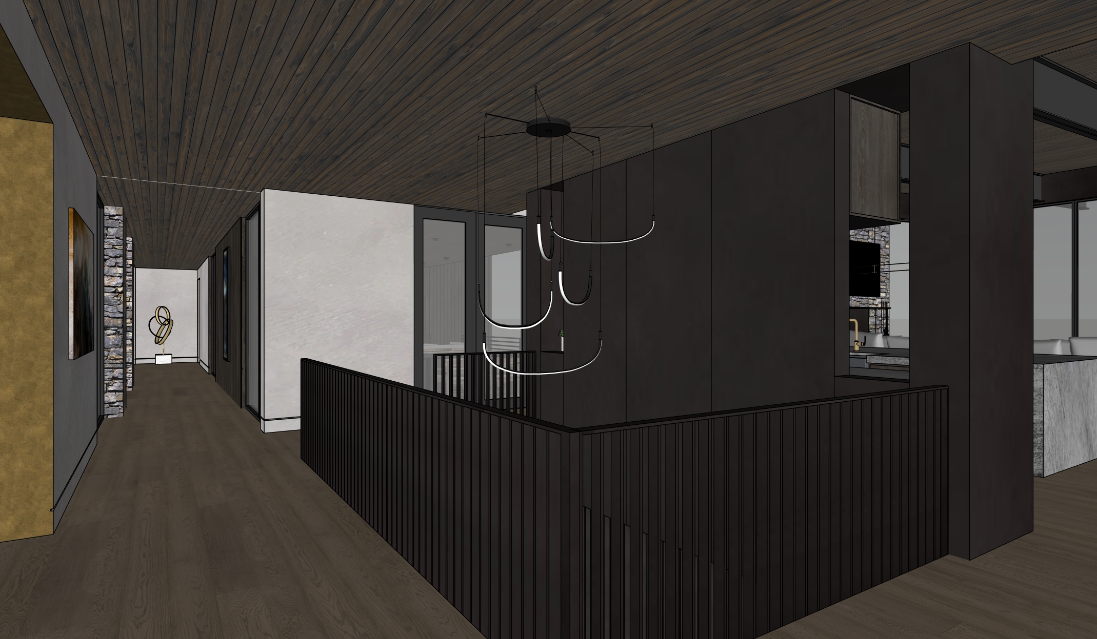 do not remove or change any geometry in image rough hewn tennessee fieldstone stained straight grain white oak tongue and groove ceiling dark metal window frames cold rolled steel panels smooth finished stucco walls add square can lights to ceiling home located in north carolina hardwood forest with dense trees below home soft early morning light with light fog in trees behind view of blue ridge mountains in distance room is 20 above the ground so no plants or hardscape directly outside of windows add painting to blank wall add tapestry to steel wall