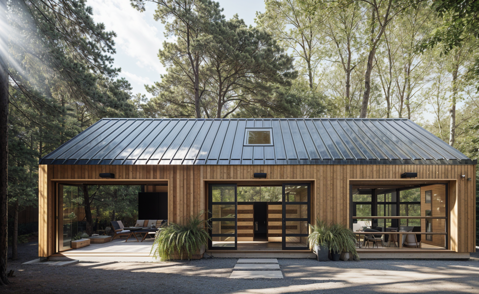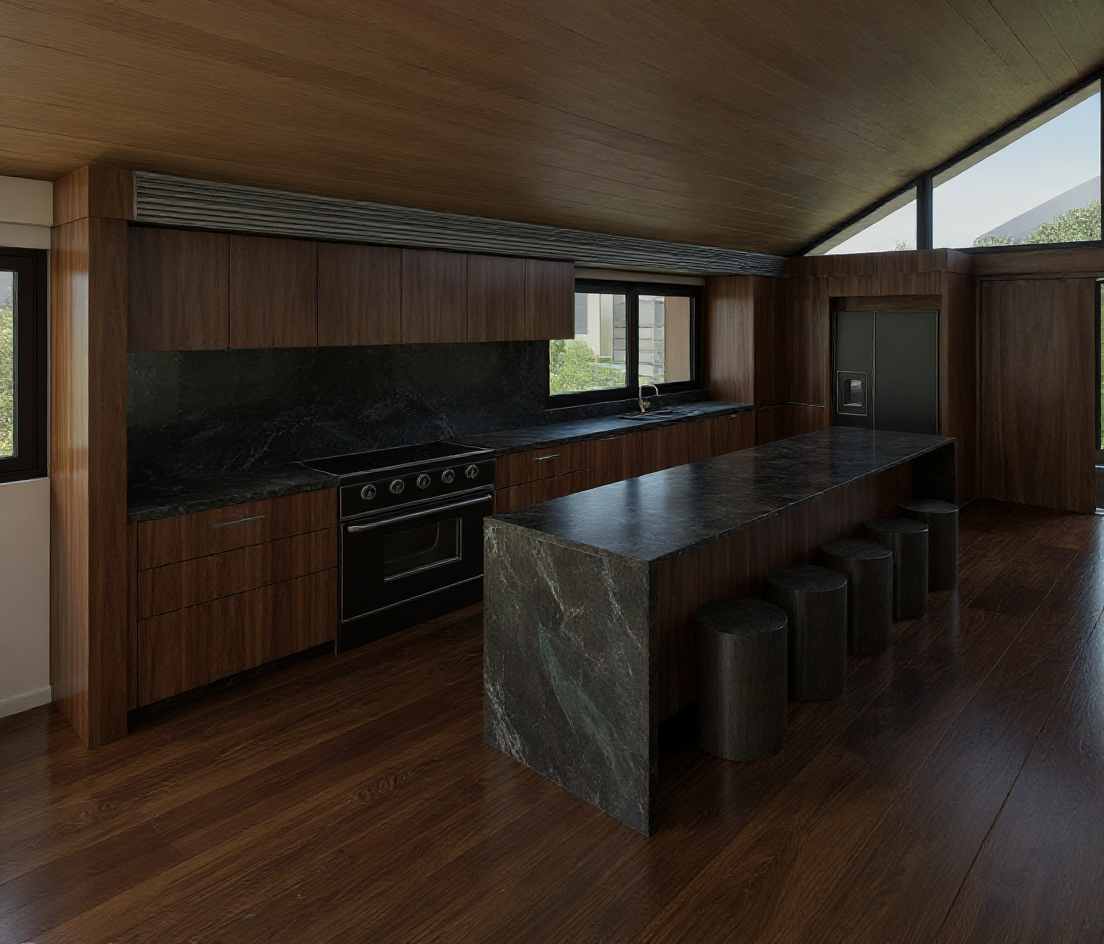 make oven and fridge black make air conditioning lineal grill black make highlight windows to show no eave and tree only make flooring black make ceiling white