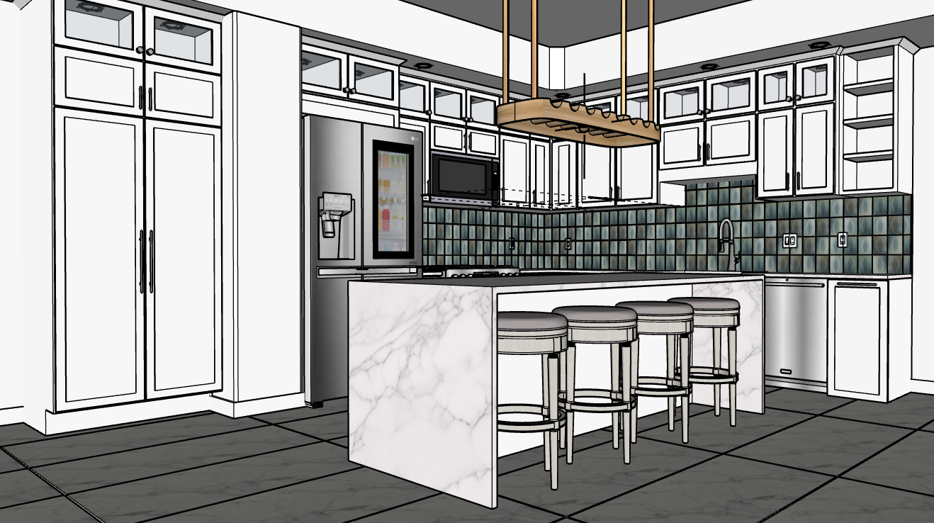 create a realistic render of this scene the floor and the island is with same marbel texture floor marbel is slightly matte and the island marble is more reflective add warm down spot lights inside the upper cabinets the kitchen island has a translucent white accrylic bottome thruogh which light is passing through create a caustic effect on the island only and faint effect on the floor