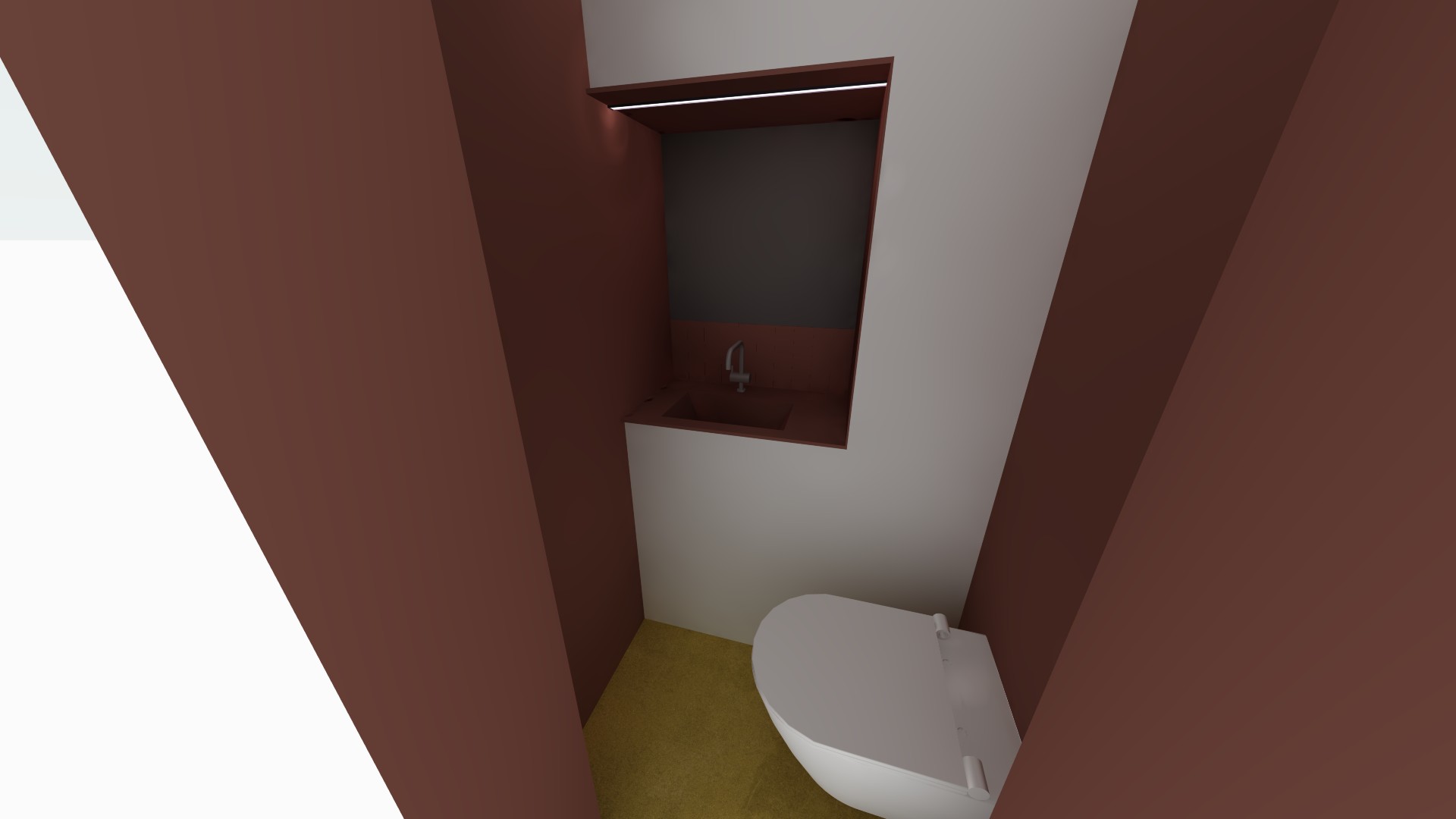 render this image with realistic materials keep room geometry exactly as in the input add light to the lamps in the ceiling make the wall in the back of the niche consist of tiles and above tiles a mirror covering the entire surface other walls is a dark and warm coloured plaster transform the picture into a varm and nice toilet with cool designer stuff render this image with realistic materials keep geometry exactly as in the input make it look nordic cool no modifications to openings windows or roof shape change the material of the interior window reveals to polished and reflecting steel add utillites by the sink like soap and towels