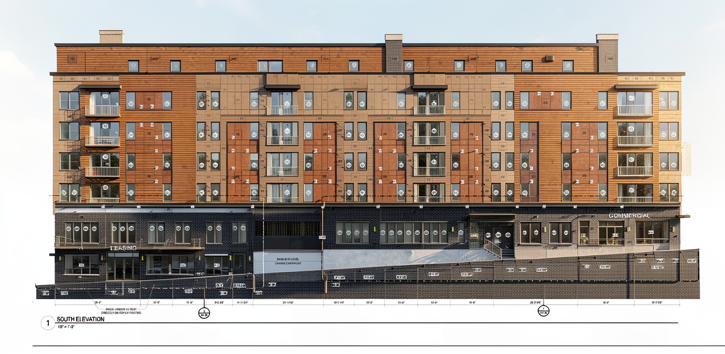 this is an elevation of a building there are no sloped roofs the top level is more lap siding and is painted dark gray the brown siding is meant to simulate the look of wood lap siding the bottom level is black brick with a light gray accent band towards the top the central areas are light gray and white the entire building is located on a hill with the cross slope as shown