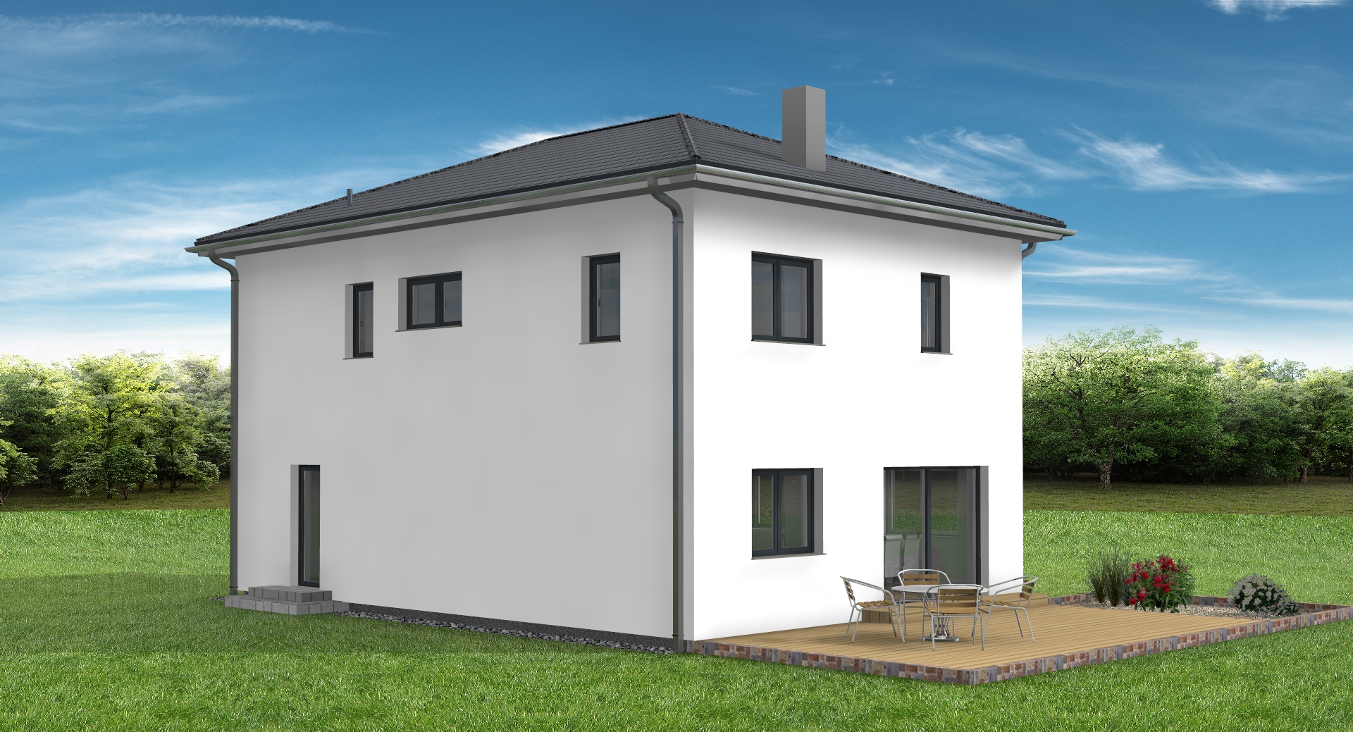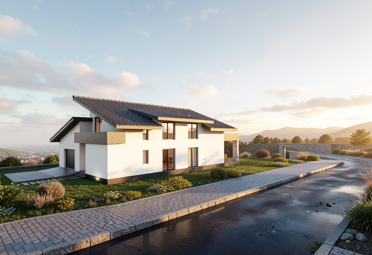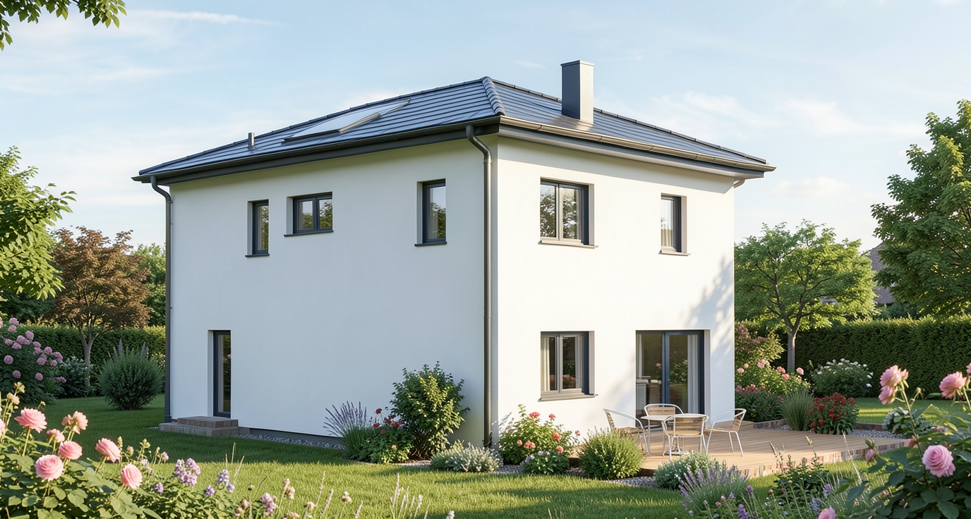 bitte erstelle f r exakt dieses haus eine realistische au enansicht s mtliche parameter und abmessungen des hauses bitte nicht ver ndern dachziegel anthrazit fenster und t ren anthraz fassade wei das haus soll bitte in einem elegant aber dezent gestalteten garten situiert sein