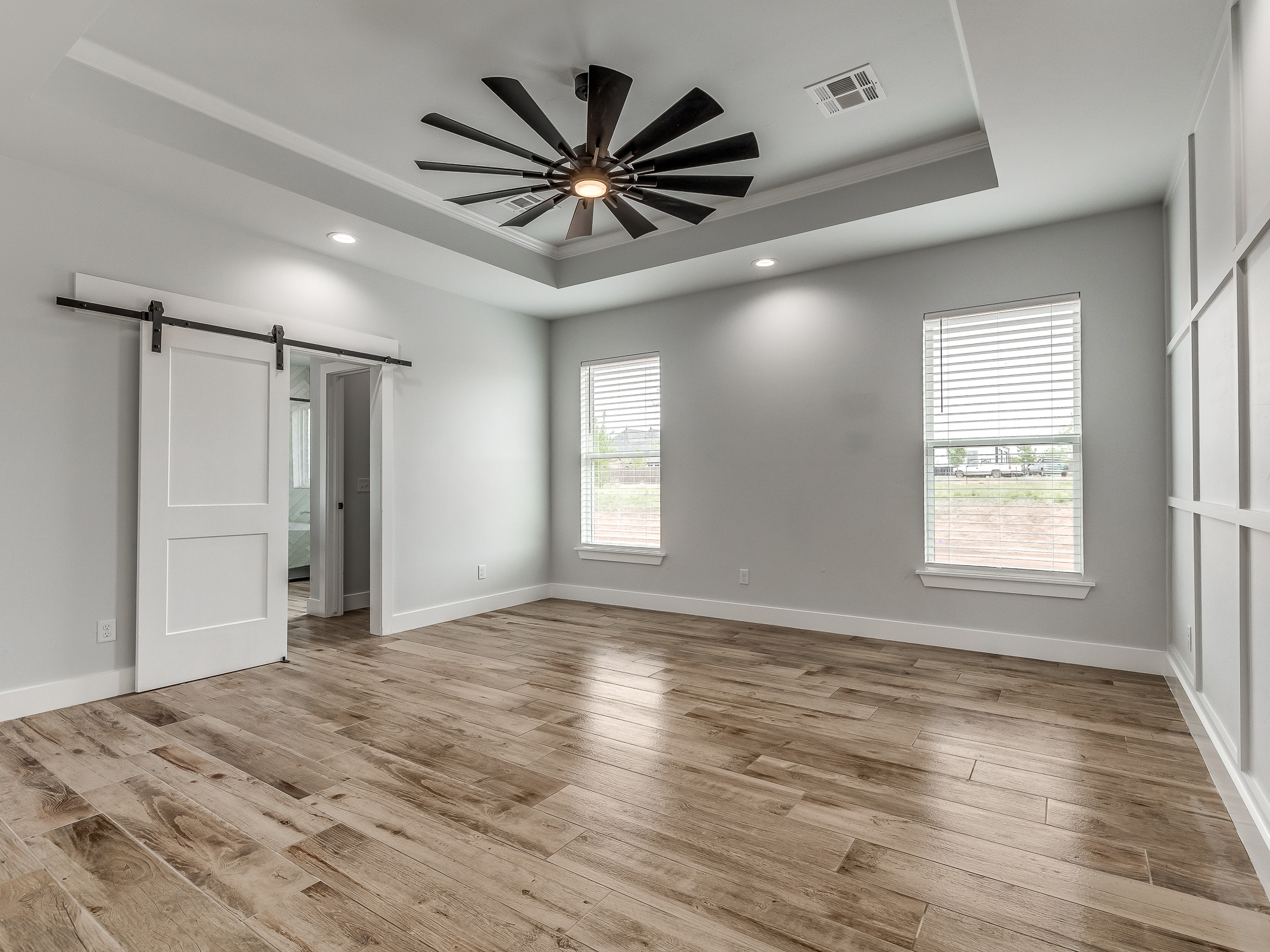 master bedroom with white and dark grey layered bedding and an accent chair and table and art work on the wall with a nice large soft rug