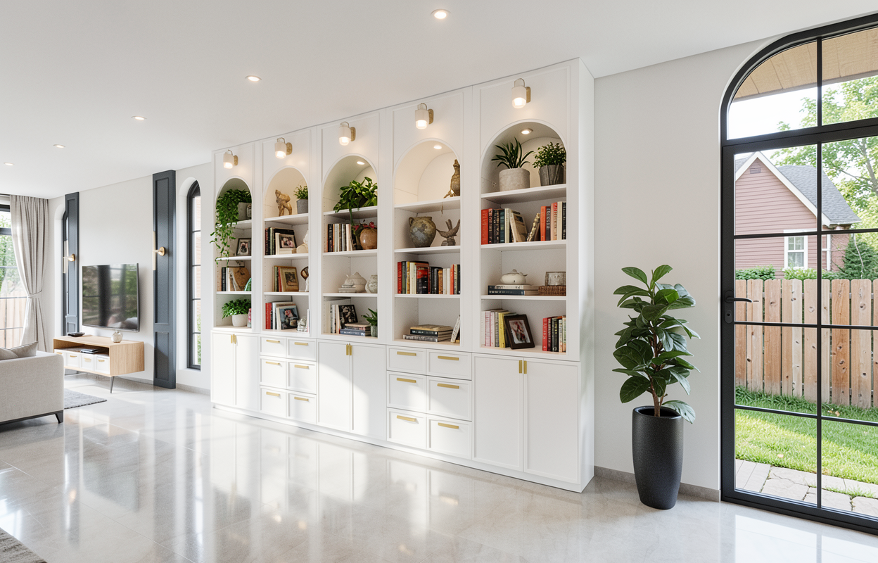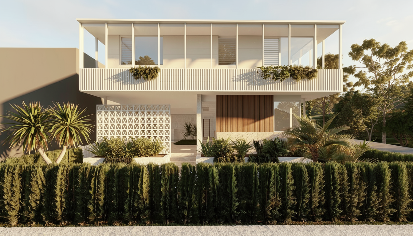 create photorealistic rendering of this stairway keep handrail light white oak floors light white oak and stair spindles champagne bronze metal posts keep spindle designs as is add eucalyptus trees and landscaping in windows keep white painted stair and floor stringer keep stairs light oak do not add any additional windows keep only visible windows in second story add light to bubble chandelier