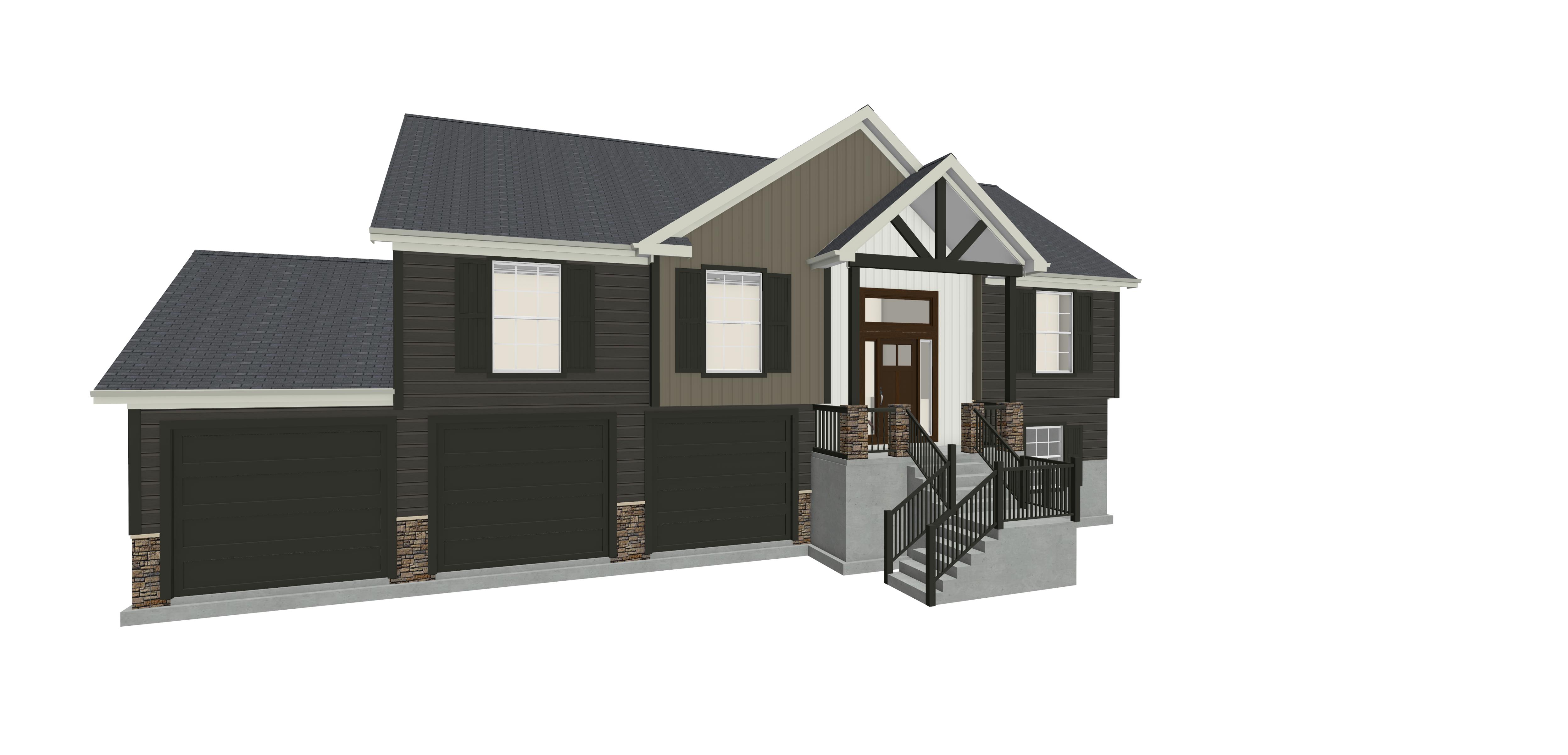 create a full color photo rendering of this bilevel home in a typical new home neighborhood the porch has timbers