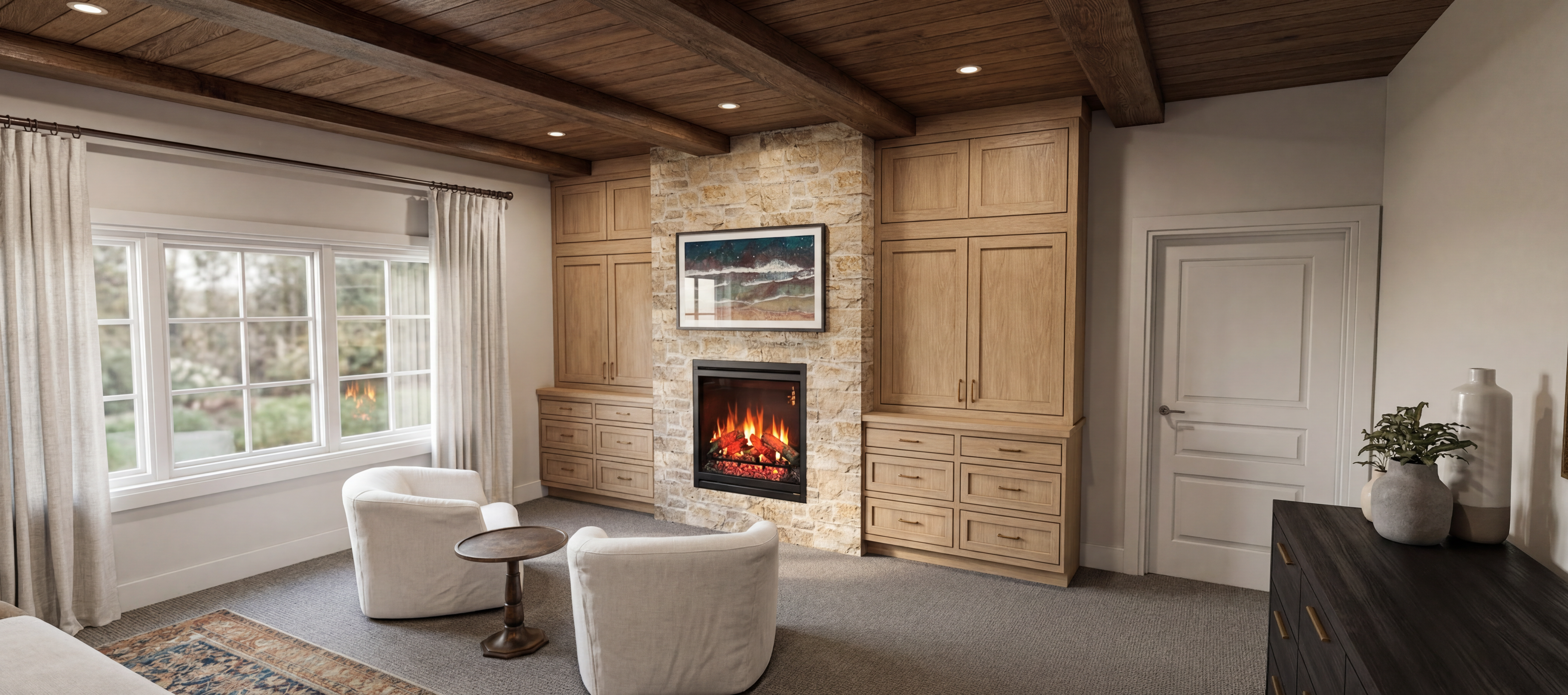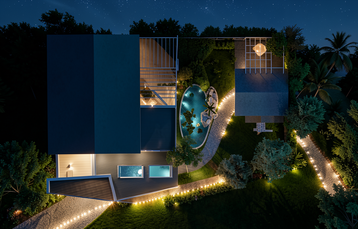 make this like a oscar night a red carpet infront of the door beside the car make the car into an aston martin but some people in elegant dresses on the carpet use the red light in front of the glass wall to give ambience put tables inside building but no people on them in front of the house is a simple street with no cars