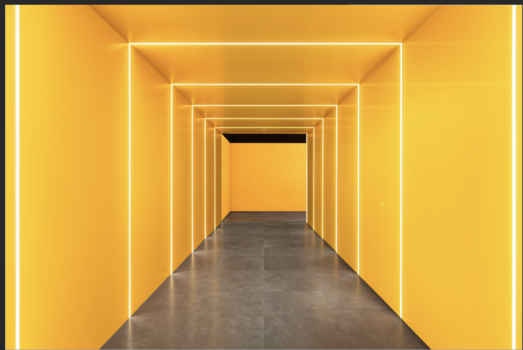 a tunnel with smooth bright warm yellow walls and ceiling illuminated by thin glowing yellow lines of led strips mounted at equal intervals creating a geometric pattern mounted within the walls the floor is a seamless smooth textured dark grey concrete adding a subtle contrast the scene should be set in a bright warm yellow orange expo atmospheric lighting conveying an air of intrigue and modernity