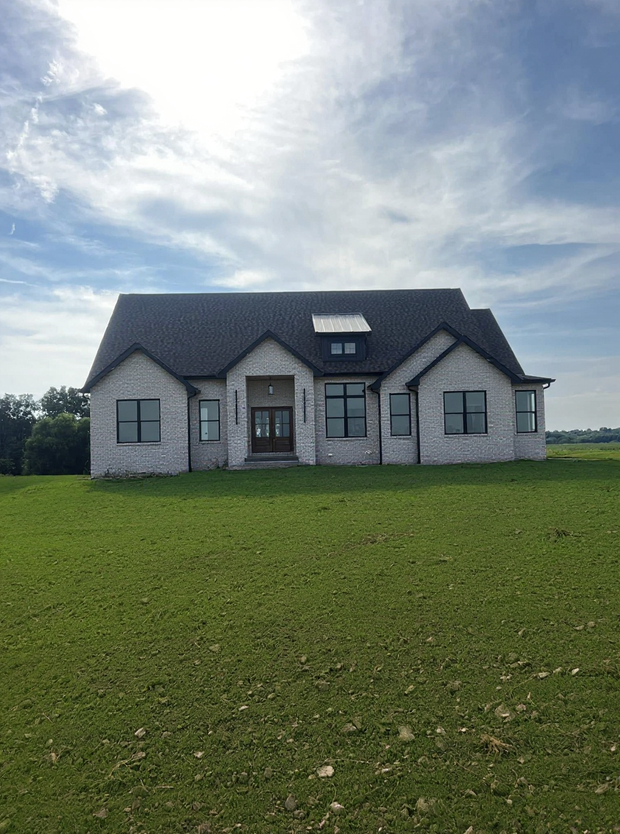 white shaker light white and cream colored stone window mullions tan front door stained white oak black exterior lights garage door matches the front door dark brown roof