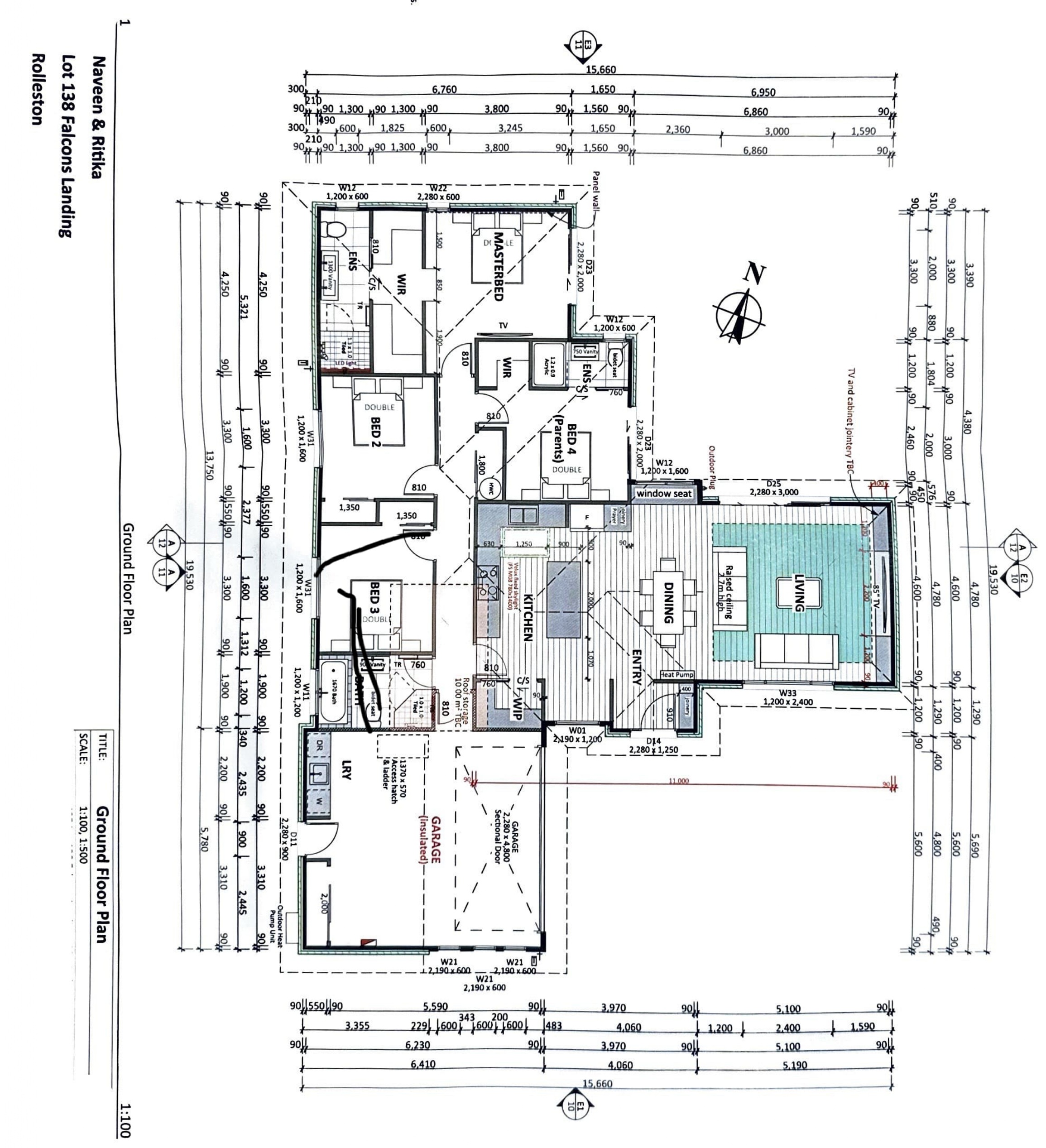 this is a concept plan for a 4 bedroom house 2 ensuites 1 bath 1 open plan living with kitchen and dining 1 double garage the living area has a boxed ceiling