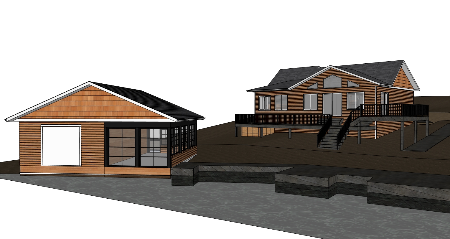 cabin is lakefront andsitting on the canadian shield the boathouse in the foreground is on the shore of the lake the property is surrounded by spruce trees poplar trees and birch trees sun is setting behind the camera