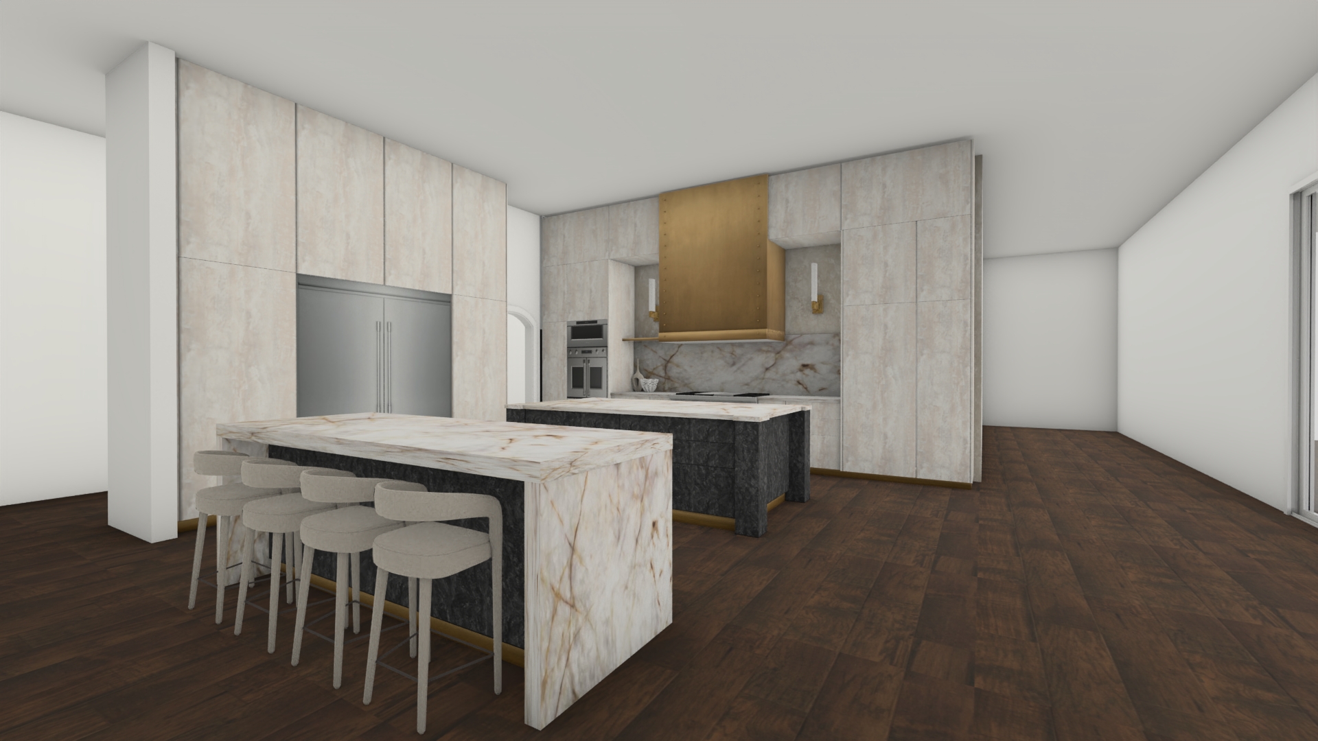 the hood in the kitchen must be a brass golden metal finish the islands are crystallo led lit so make them glow subtle dont change anything on the cabinets