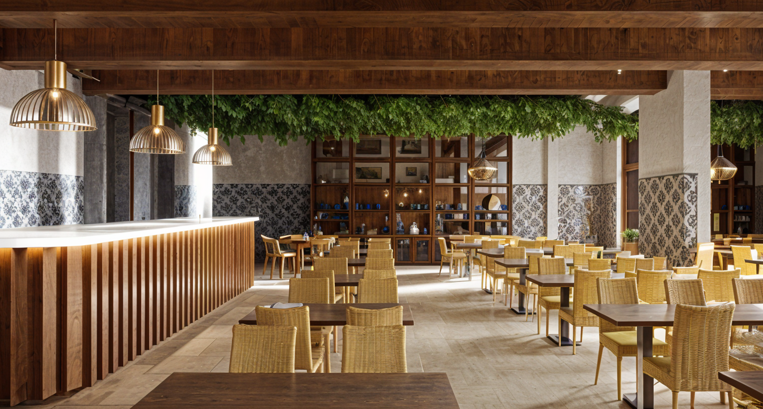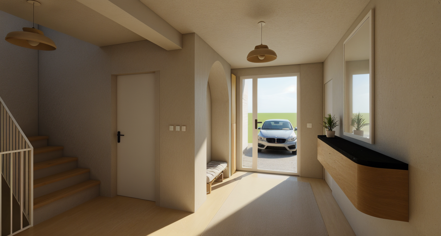 make the atmosphere warm and bright on the other side of the glass entrance door place a front facing car on the right with an urban background and a hedge behind it add a plant on top of the cabinet on the right which must remain unchanged urabn in the background