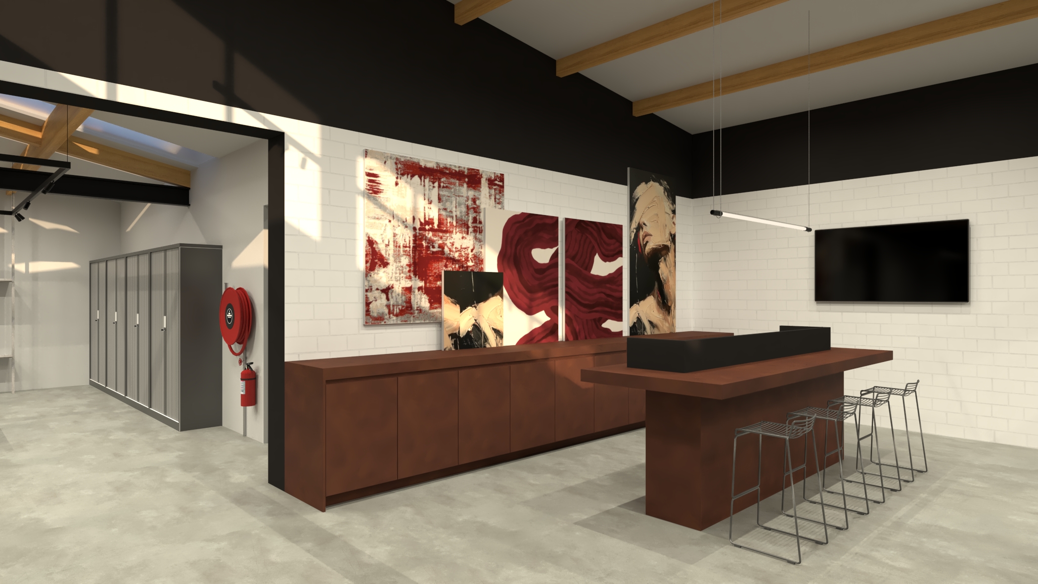 i want a realistic image of this render nothing may be changed about the content of the image only make it look realistic the floor is lightly polished concrete the white part of the ceiling should have a cellulose spray ceiling texture the texture of the spray ceiling may be very coarse the rear wall is made entirely of painted white clay bricks above the white brick wall there is a plain wall painted black so the upper part of the wall is black and smooth with no texture there are paintings hanging in front of it the lockers in the space behind that are visible on the left side are dark grey metal the bar stools are made of galvanized metal
