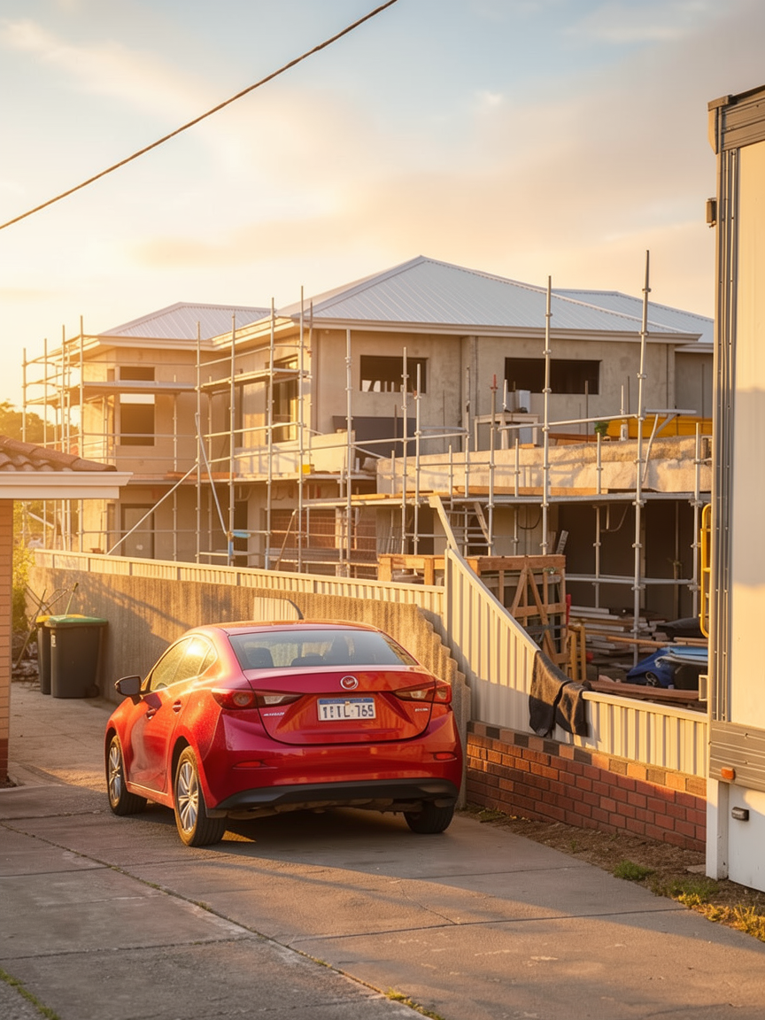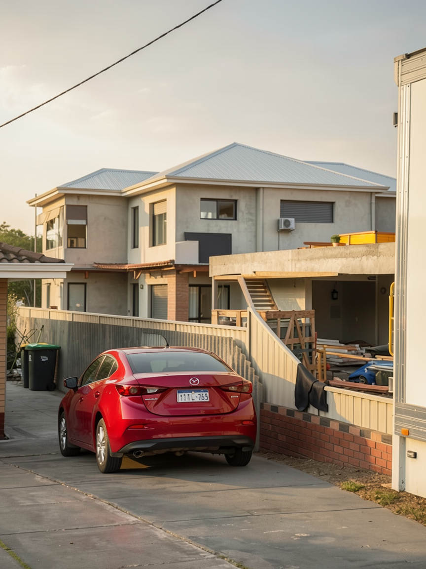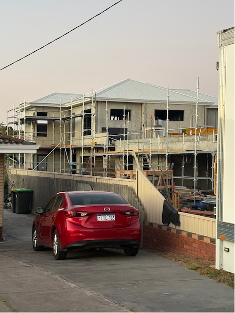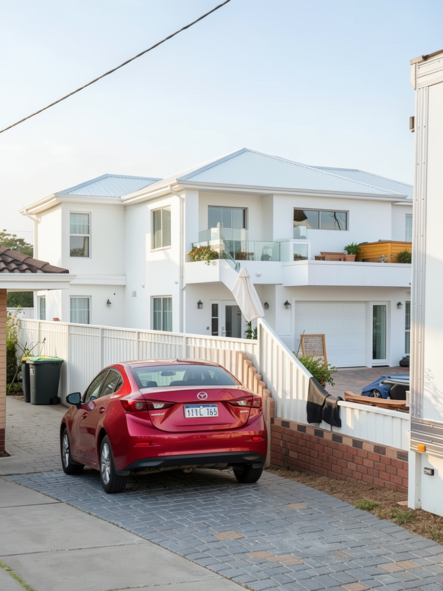 make it look finish get rid of scaf have it white and what would be the best driveway to suit it but the windows back to the coulour they are and whould an concrete exposed be the best clouler