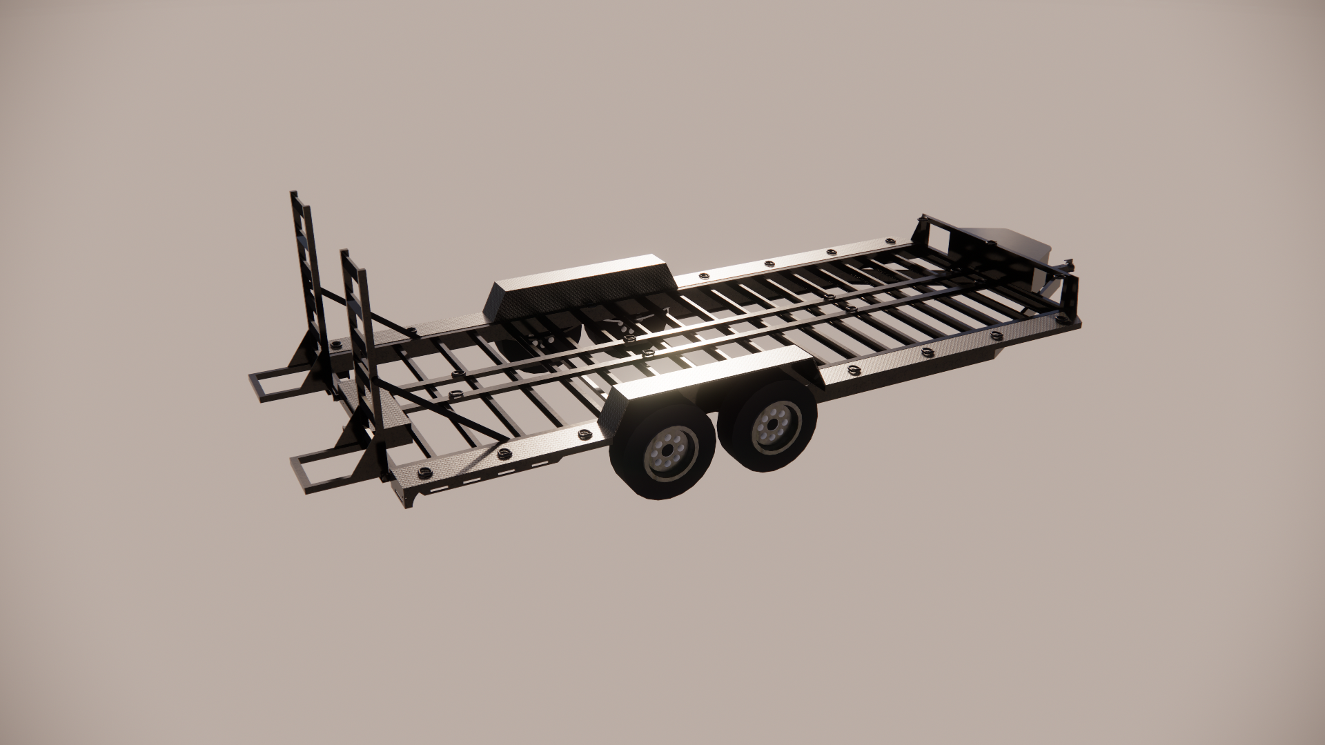 you own a trailer building company and must create the absolute best rendering of your new 20 car hauler place the trailer on a rural road in a pastoral setting it is a gloss black finish do not change anything about the trailer leave everything about the trailer exactly the same as the photo provided