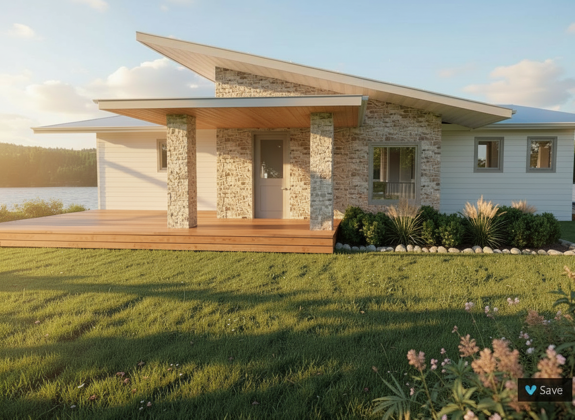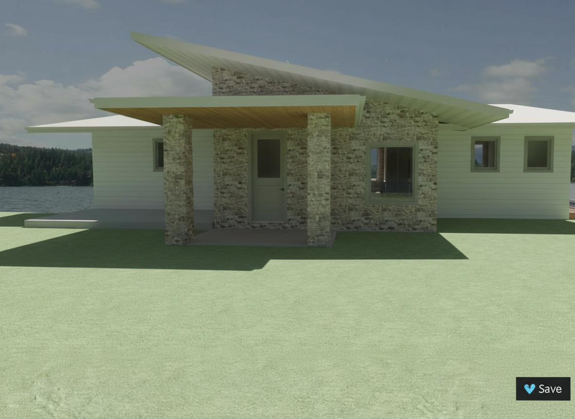 create secondary flat roof over entrance on right side of stone with stone columns on each side keep angle