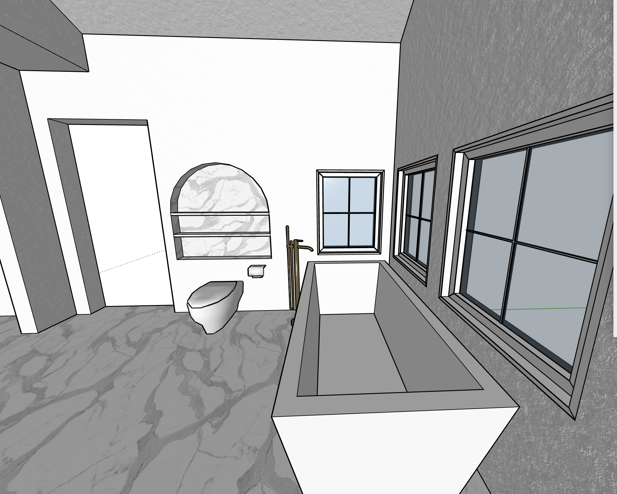 a luxurious modern bathroom with a serene and elegant atmosphere the walls are painted in soft white tones complemented by white trims and edges the floor is a sophisticated marble with a mix of light and dark gray veins that reflects light with subtle sheen natural light to flow in creating a bright and airy atmosphere all hardware is brass nice weather outside trees seen in bokeh lit by lights and natural lighting