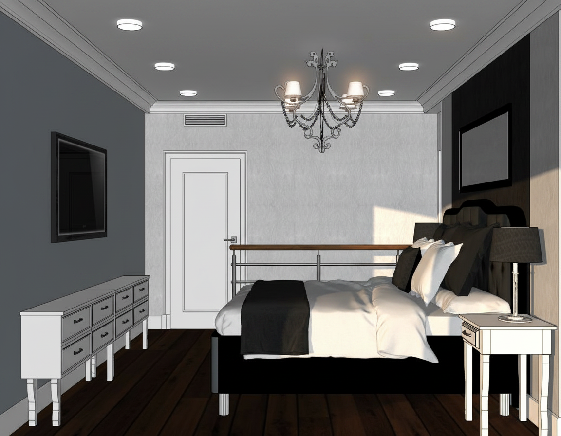 international style interior shot create a photorealistic interior visualization based strictly on the provided image do not add remove or modify any elements materials furniture or layout do not add any new windows anywhere else do not place windows on other walls ensure the sunlight reflection on the glass is smooth and continuous without any grid lines or breaks maintain correct scale and proportions use physically accurate lighting with soft global illumination all lamps are turned on and emit warm light with visible light sources keep natural exposure consistent with the original image use high quality realistic textures with precise detail ensure accurate reflections and soft shadows do not apply any stylization or artistic effects the result must be strictly photorealistic and match the original scene as closely as possible add four circle evenly spaced surface mounted white four circle spotlights to the ceiling with a simple modern design and make sure the lights are turned on emitting soft natural lighting on the right side there is a framed mirror and on the left side there is a framed tv dont change aything ceiling is white add sunlight reflections on the right is mirror in frame architecture