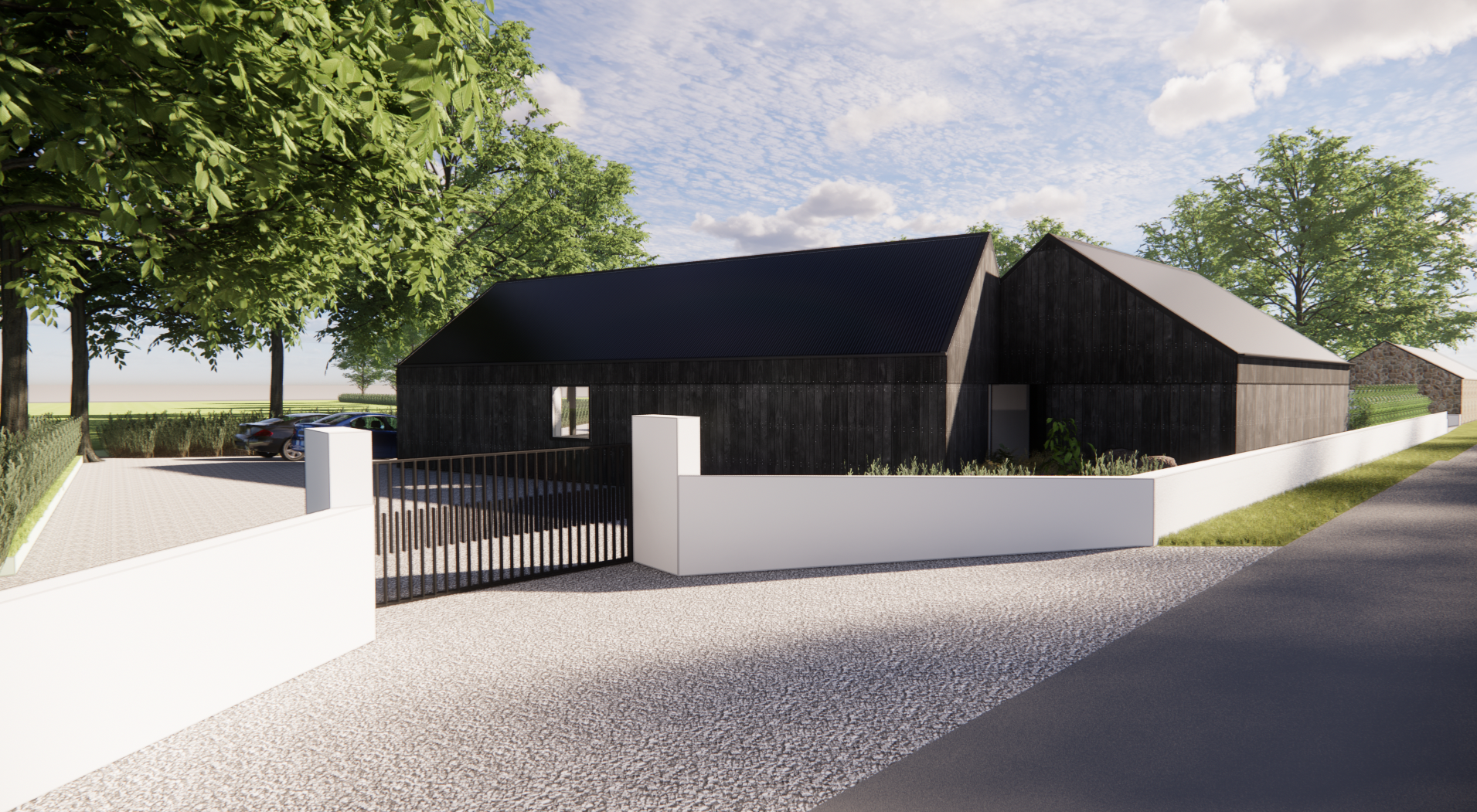 view from a rural road towards the new entrance to the house black corrugated roof cladding grey pebble covering to the ground white rendered boundary wall with black steel entrance gate old road to the right of the image freeze geometries