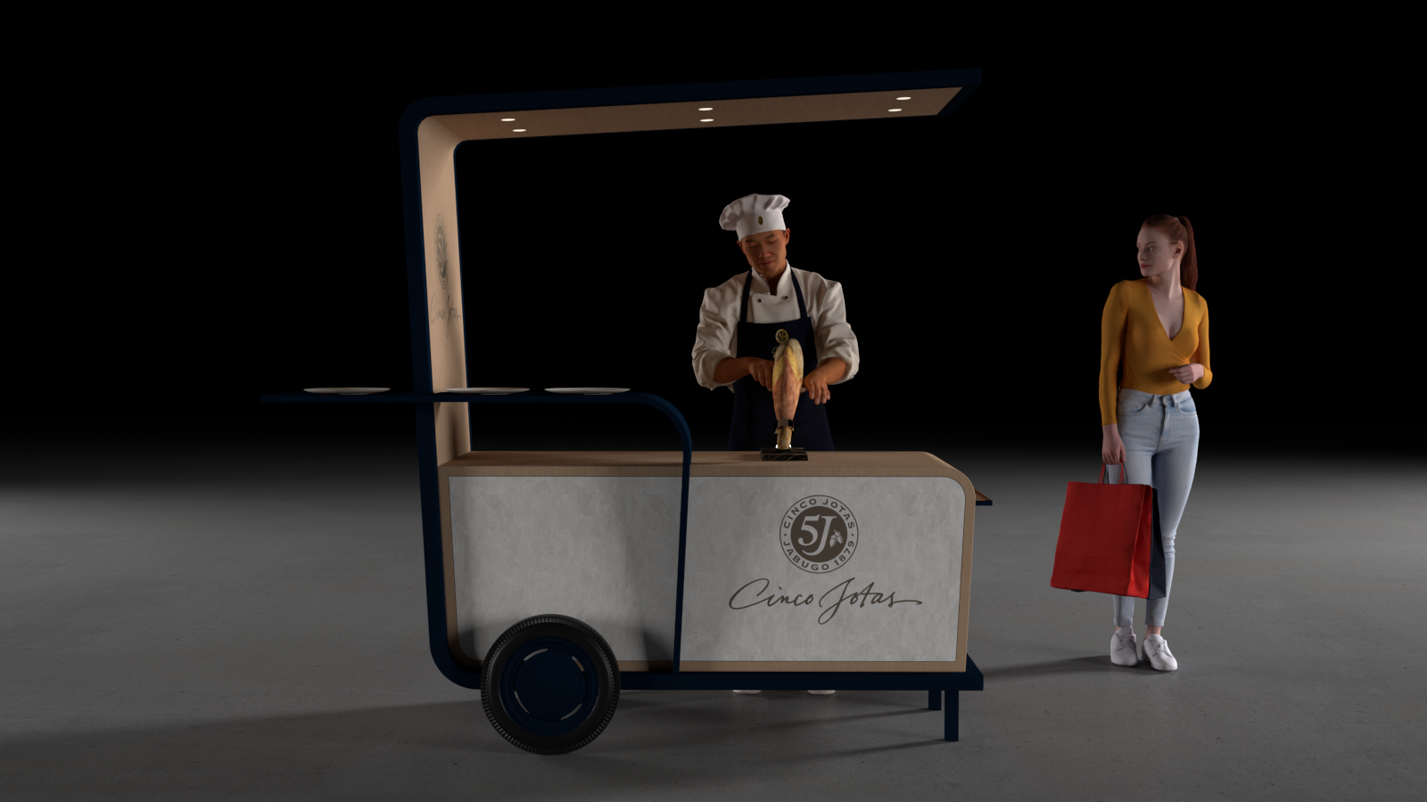 modernist exterior shot create a realistic and detailed scene of a mobile food cart in a dimly lit modern setting the cart features a smooth light wooden texture with a matte finish accented by a deep navy blue frame elegant lighting glows from the cart s ceiling casting a warm ambiance a skilled chef in a classic white uniform and navy apron is slicing cured ham with precision nearby a young woman with long red hair in a mustard yellow top and light denim jeans stands gracefully holding a vivid red shopping bag the atmosphere is sophisticated and inviting with a focus on the harmonious blend of colors and textures architecture