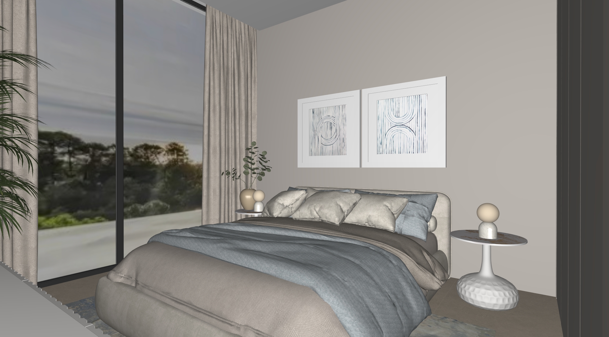 photorealistic render of the exact same bedroom preserve all furniture and layout realistic lighting soft natural sunlight detailed fabrics high quality materials soft shadows global illumination architectural visualization no changes add only light