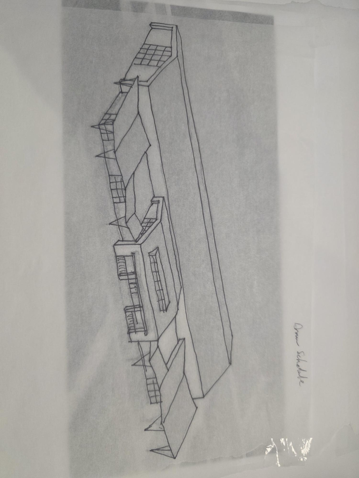 render a modern architectural complex with a series of interconnected flat roofed buildings use a warm sunny afternoon lighting to create soft shadows the main building features large glass panel windows that reflect a clear blue sky incorporate natural materials like light oak wood and white concrete for the fa ades add lush greenery around the perimeter with vibrant green trees and shrubs the atmosphere should be serene and inviting with a clear bright sky overhead