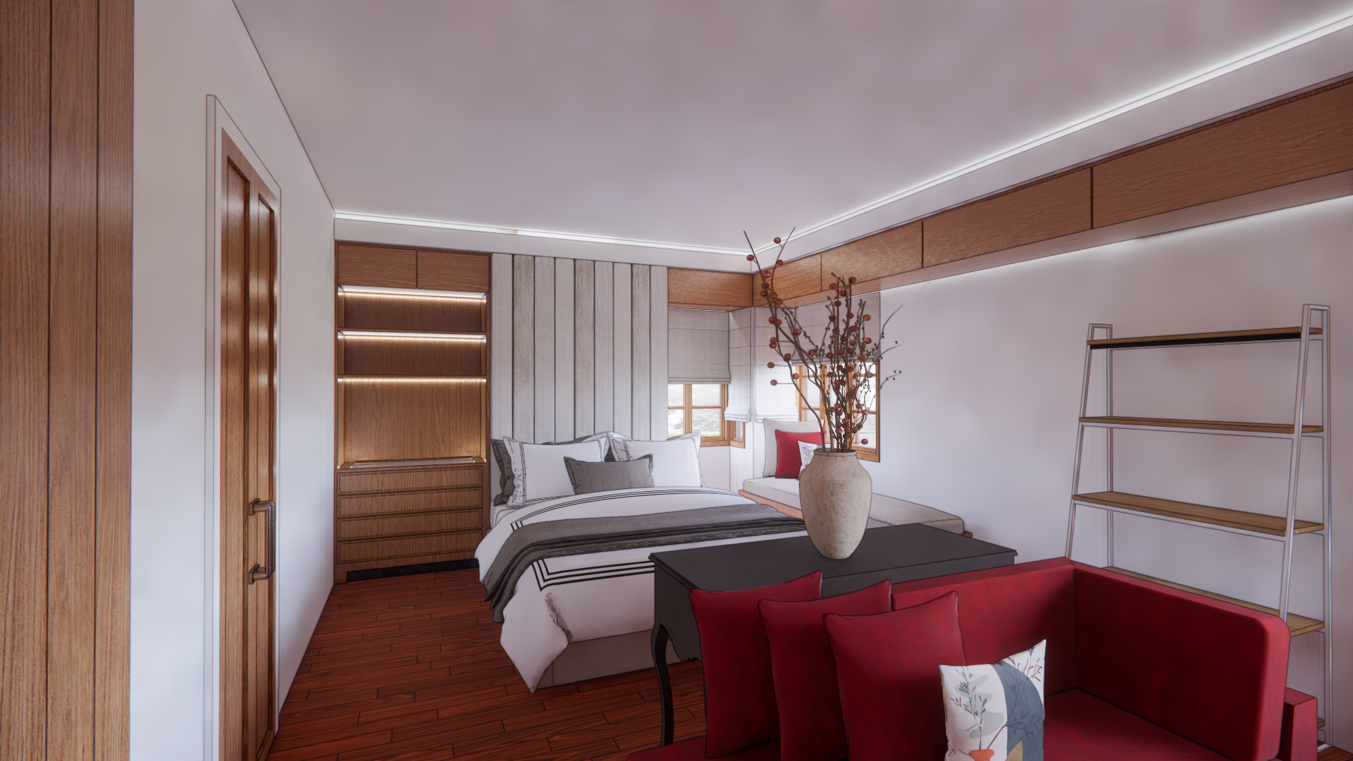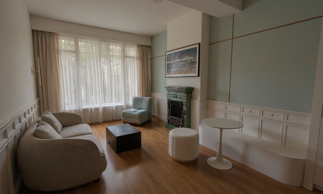 interior shot enhance the original living room render without changing any existing elements composition or furniture only adjust materials lighting and color tones to match the warm contemporary mood board apply soft natural morning light with gentle highlights and realistic shadows refine materials to have matte beige walls walnut toned wood surfaces and linen or wool textured fabrics keep the palette warm and neutral cream sand taupe and caramel hues enhance overall contrast softly for depth while maintaining natural color balance ensure all surfaces show tactile realism and a cozy elegant ambience consistent with the mood board keep reflections subtle lighting cinematic yet natural and atmosphere serene architecture