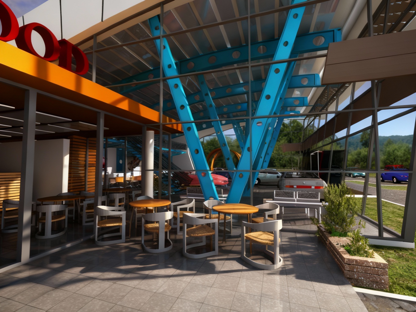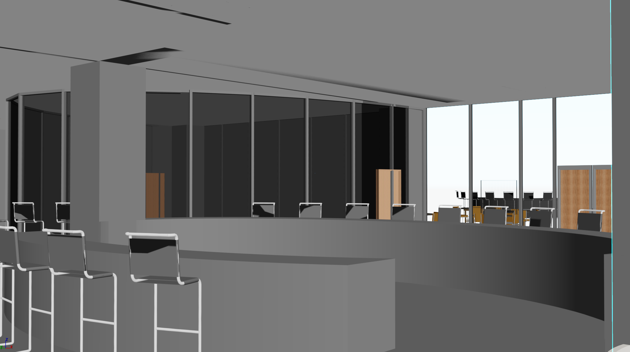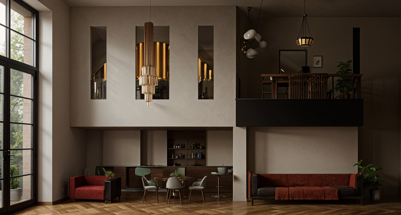 modernist exterior shot japanese style hotel bar with hints of a muted red and a lot of different textures it includs a bar and a kitchen behdind the large windows architecture