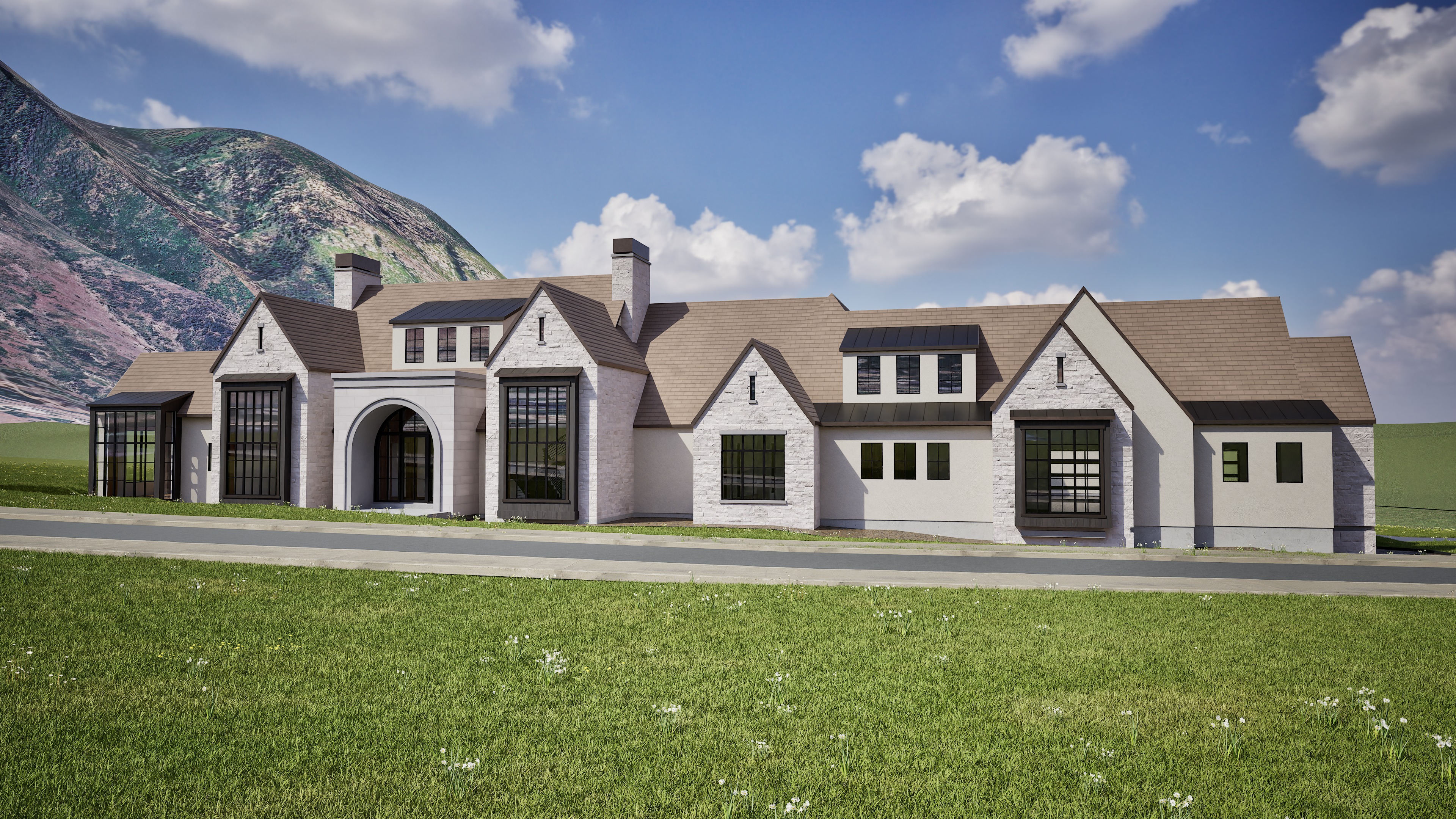 don t change the structure a modern traditional mansion made from the following materials white cream dry stacked stone veneer cream stucco a light brown beige asphalt shingle and a dark gray wood material enhance all materials to feel more realistic and natural with enhanced textures and shadows add vegetation around the exterior of the home and add plants in the foreground in front of the road and curb change the sky to be a bright noon summer vibrant day add a tree in the background on the right enhance the terrain in the background to have more realistic plants trees dirt and rocks on it