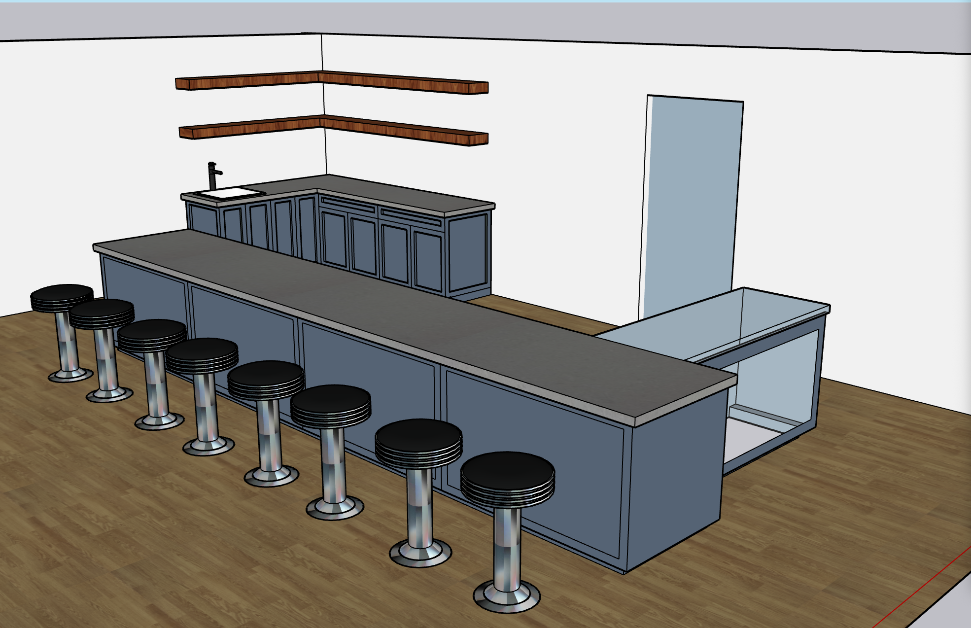 interior shot please maintain the glass top and glass front on the small peninusla cabinet as shown in my concept drawing the stools are vintage diner stools with shiny chrome on the body and black leather on the seats