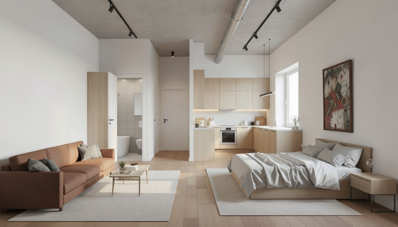 genera un render del espacio adjunto desde una perspectiva diferente a la original la nueva vista debe enfocarse en resaltar la composici n arquitect nica iluminaci n y materiales del ambiente es importante que en esta toma no se vea la cocina ni el ba o que se encuentra al fondo ajusta el encuadre ngulo de c mara o elementos de obstrucci n visual si es necesario para ocultarlos completamente manteniendo una imagen est tica coherente y profesional