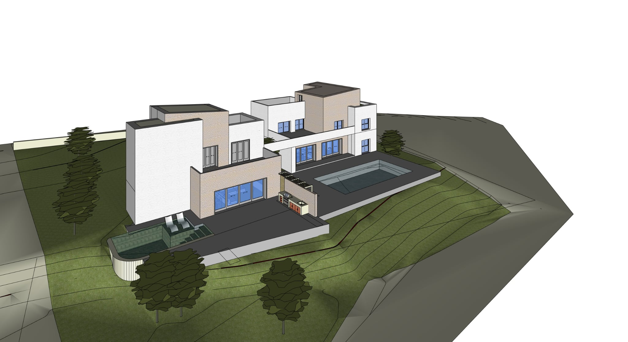 a villa named arfna in rhodes greece made out of natural coloured stone and ivory plaster there are two pools in front of it made of ivory tiles as all the verandas too in the left pool the sunbeds are white polypropelenium and they are half in the water