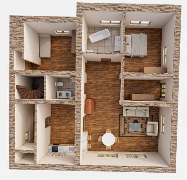 keep this image but in the utility room the two washing machines should have pure white tops the kitchen table should be a light wood color remove the hob and sink from the kitchen counter leaving only the worktop visible everything else should remain the same