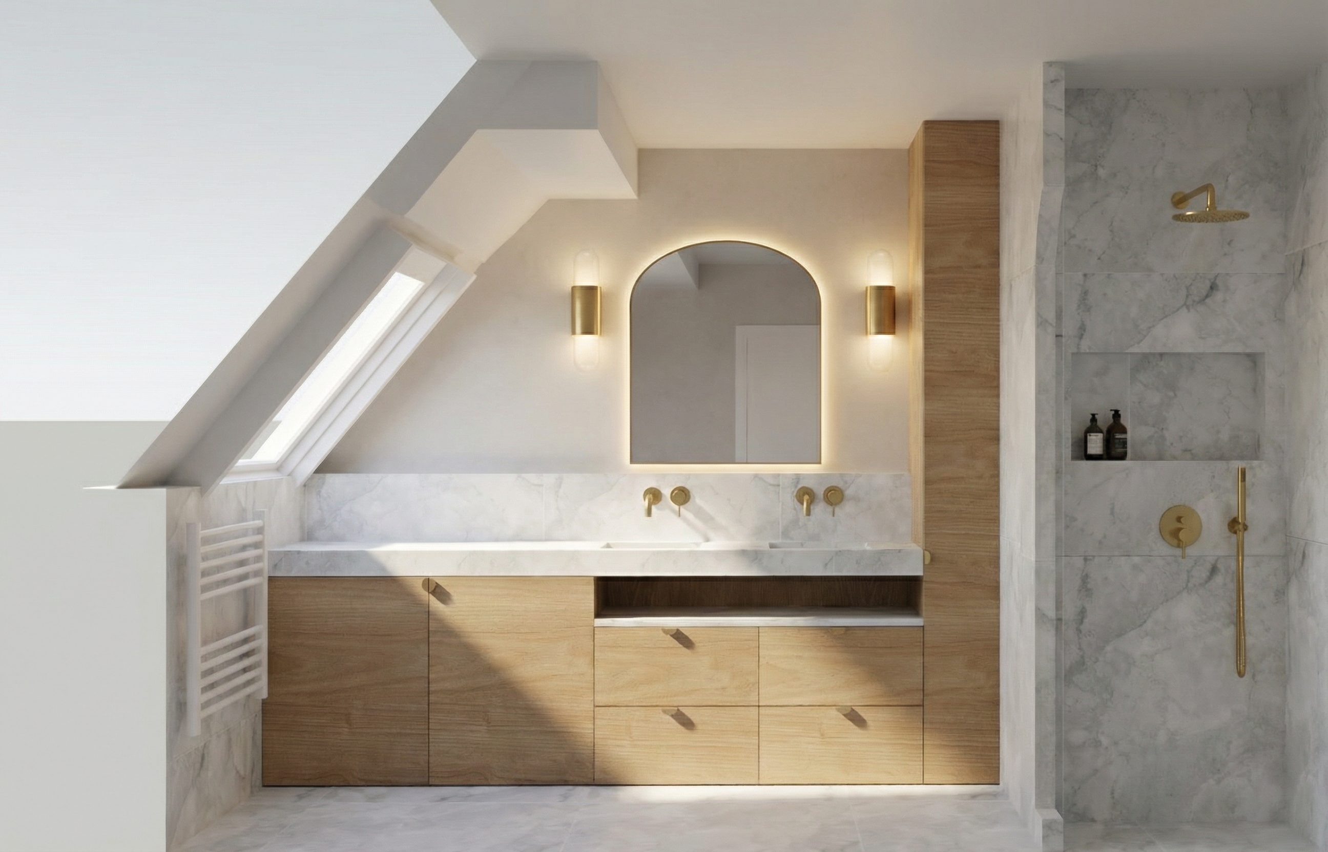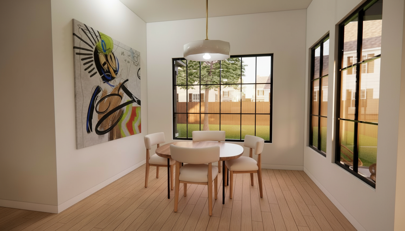 corner perspective with bench on left hand side and sofa on right hand side chair in foreground